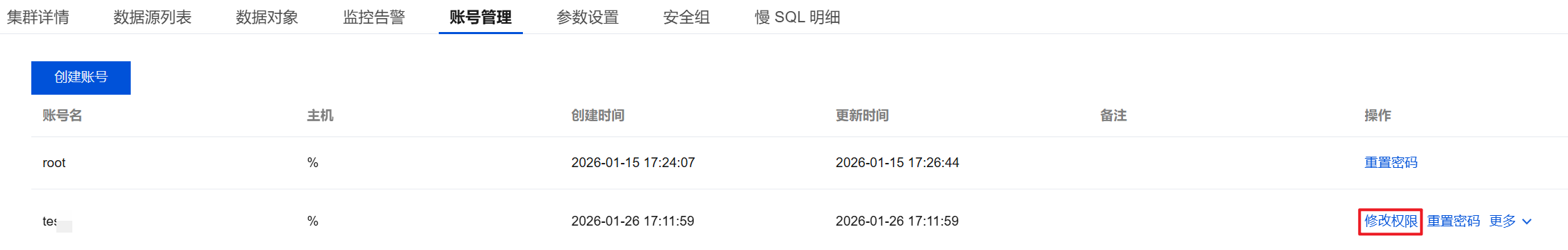 1. 在账号管理页面下,找到目标账号,单击其操作列的修改权限。