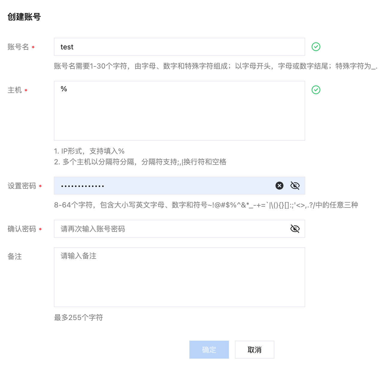 账号名:账号名需要1 - 30个字符,由字母、数字和特殊字符组成;以字母开头,字母或数字结尾;特殊字符为_。