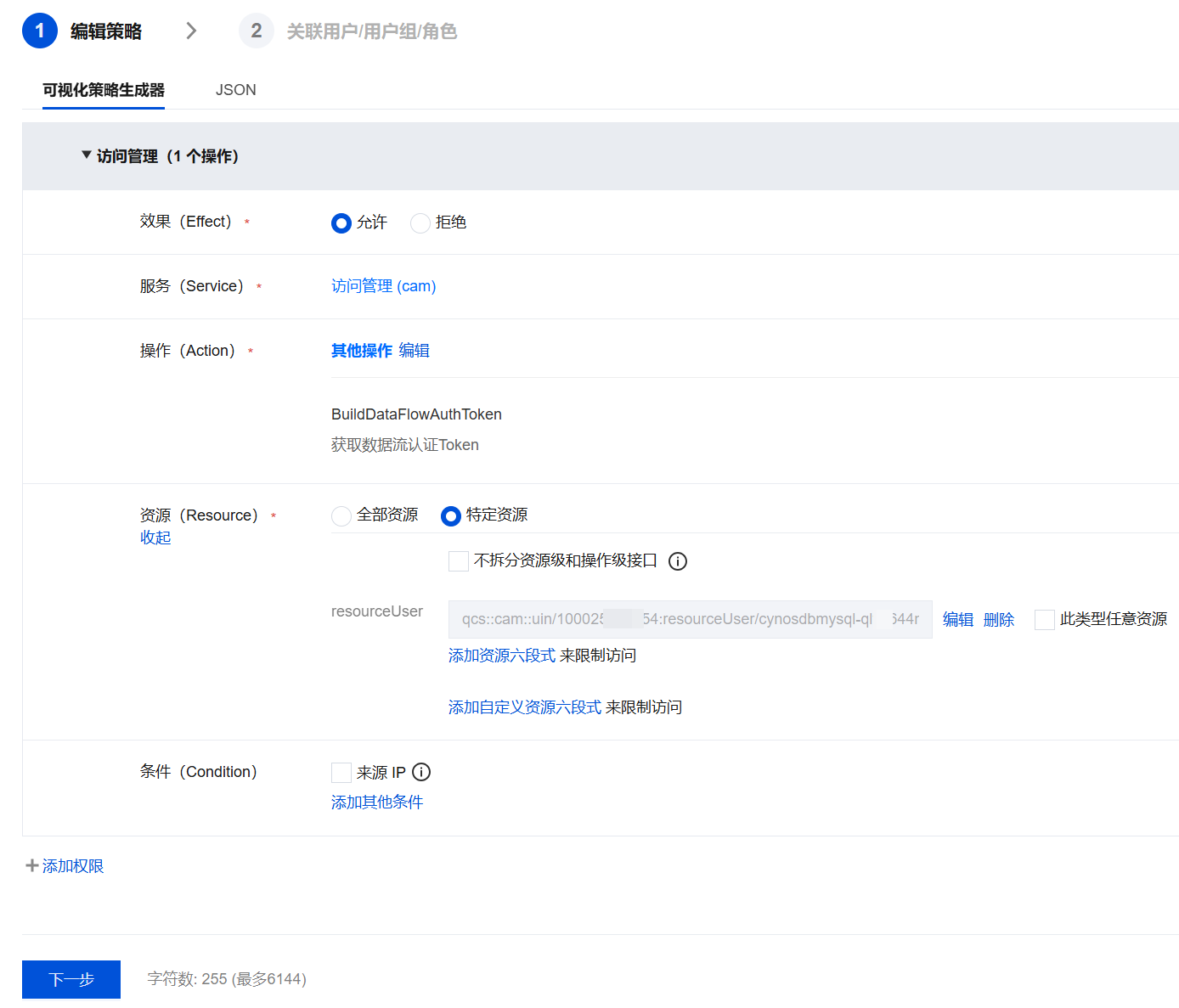 {"version": "2.0","statement": [{"effect": "allow","action": ["cam:BuildDataFlowAuthToken"],"resource": ["qcs::cam::uin/<用户 uin>:resourceUser/<实例 ID>/<账号名>"]}]}
