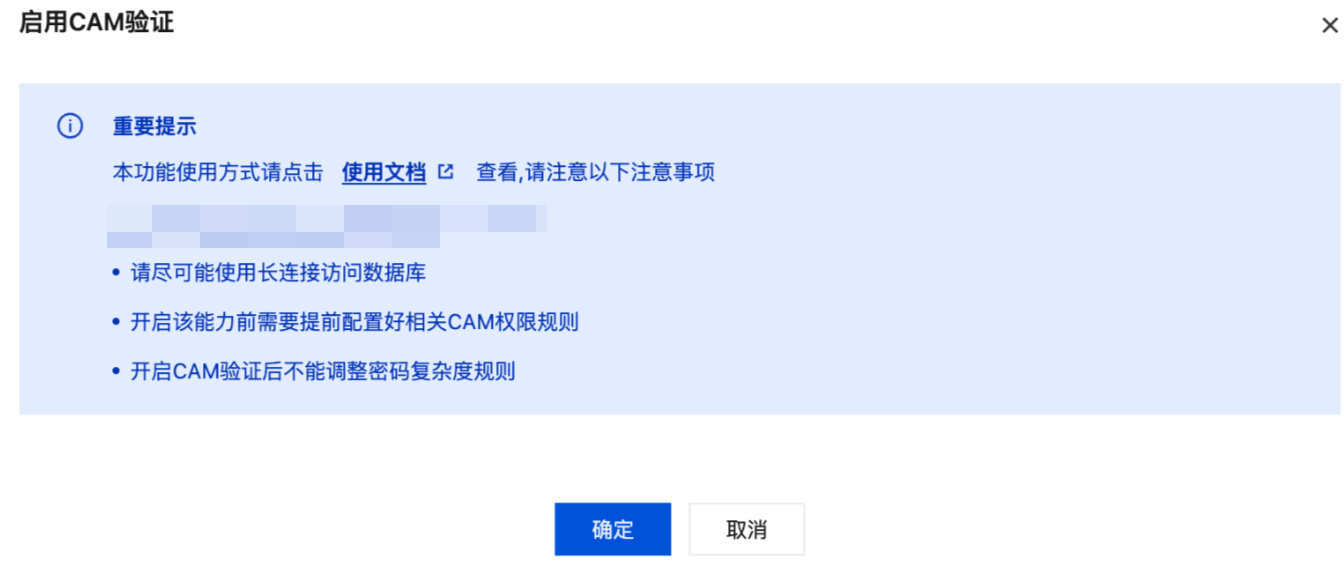 如果用户对安全性有较高要求,可以通过本功能将 CAM 与数据库账号验证相绑定,用户在请求时可获取对应的动态密码来访问数据库,以提升数据库的安全性。我们建议如下两种场景,启用 CAM 验证。