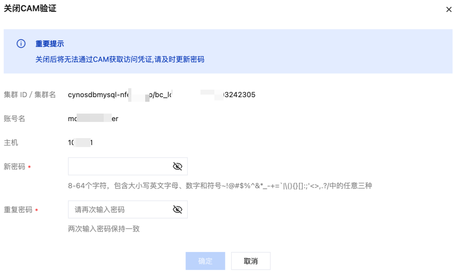 关闭 CAM 验证后将无法通过 CAM 获取访问凭证,因此在关闭 CAM 验证时需要输入一个新密码。