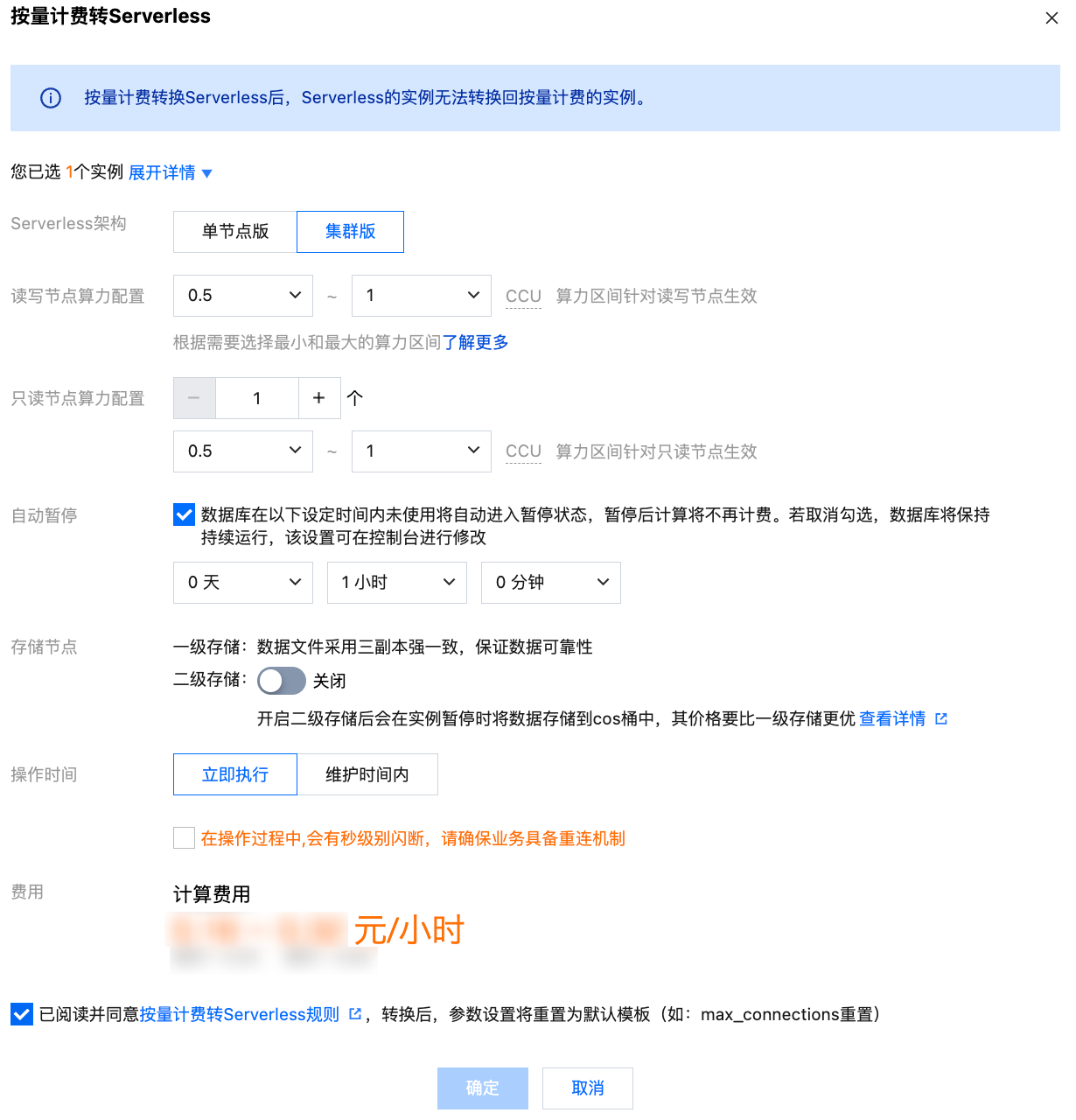 3. 在弹出的对话框,设置所要转换 Serverless 数据库的相关配置,阅读并勾选同意规则,单击确定。