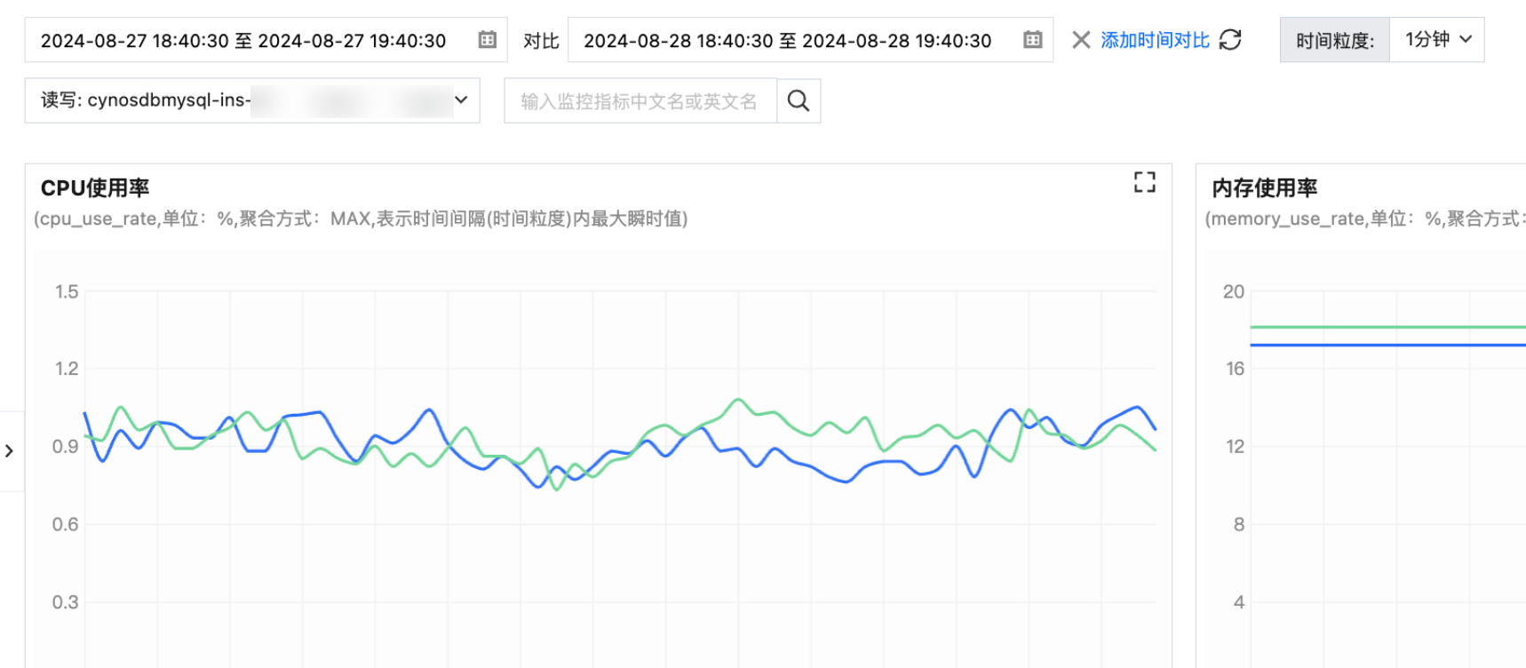 7. 选择好对比时间后,即可在下方查询对应实例所选对比时间范围的监控指标详情,支持调整时间粒度进行查看。