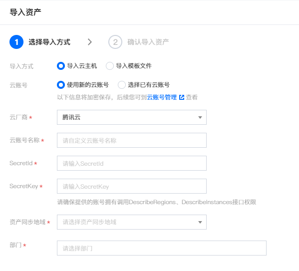 当需要将腾讯云、阿里云云厂商账号下的云主机资产快速导入到管理平台时,可通过导入云主机的在线导入方式,填写云账号信息并选择资产完成导入,实现云主机资产的集中管理与运维。