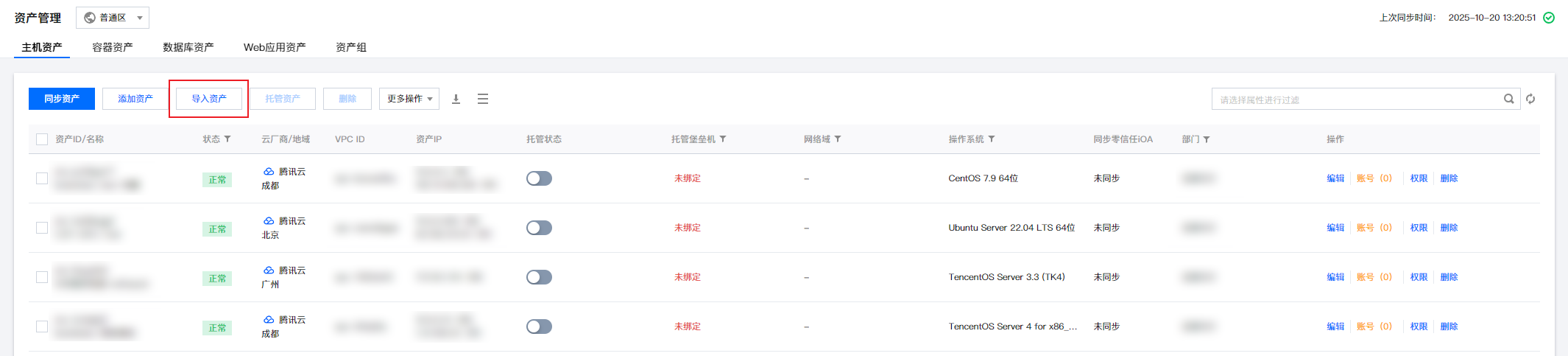 3. 在主机资产页面,单击导入资产。
