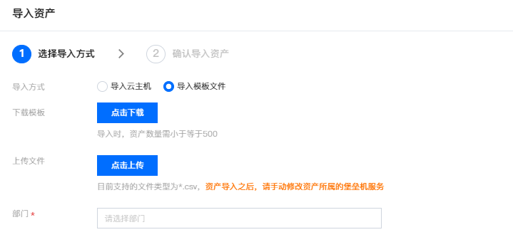 4. 在导入资产页面,导入方式选择导入模板文件,单击点击下载,获取系统提供的资产导入模板。