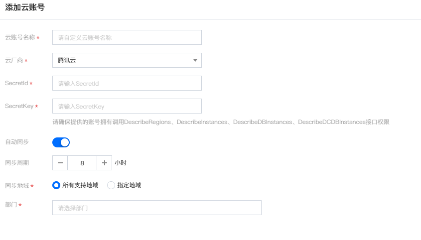 SecretId & SecretKey | 云厂商账号的 API 访问密钥 ID(用于系统调用云厂商接口同步资产) 若云厂商选择腾讯云,则在对应输入框中,填写腾讯云账号的 SecretId 和 SecretKey 。 注意: 需确保该账号拥有 DescribeRegions、DescribeInstances、DescribeDBInstances、DescribeDCDBInstances 等接口调用权限,否则无法拉取资产信息。 若云厂商选择阿里云,则在对应输入框中,填写阿里云账号的 AccessKey ID 和 AccessKey Secret 。 注意: 请确保提供的账号拥有调用DescribeRegions、DescribeInstances、DescribeDBInstances接口权限,否则无法拉取资产信息。 |