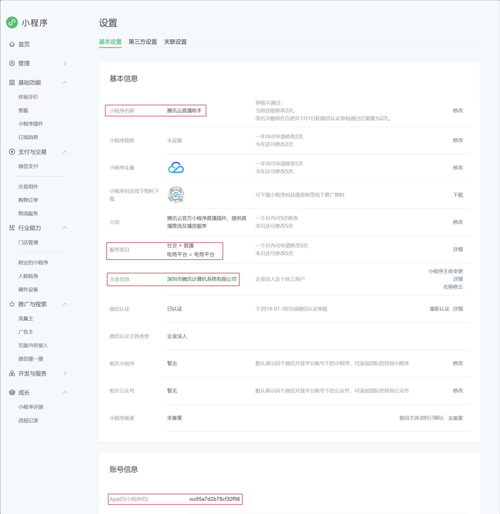 > 设置 > 基本设置中,确定已具备符合接入的类目,然后保存基本信息界面的截图(如下图,含小程序名称、服务类目、主体信息与 AppID(小程序 ID),并记录小程序的 AppID 用于填写申请信息。