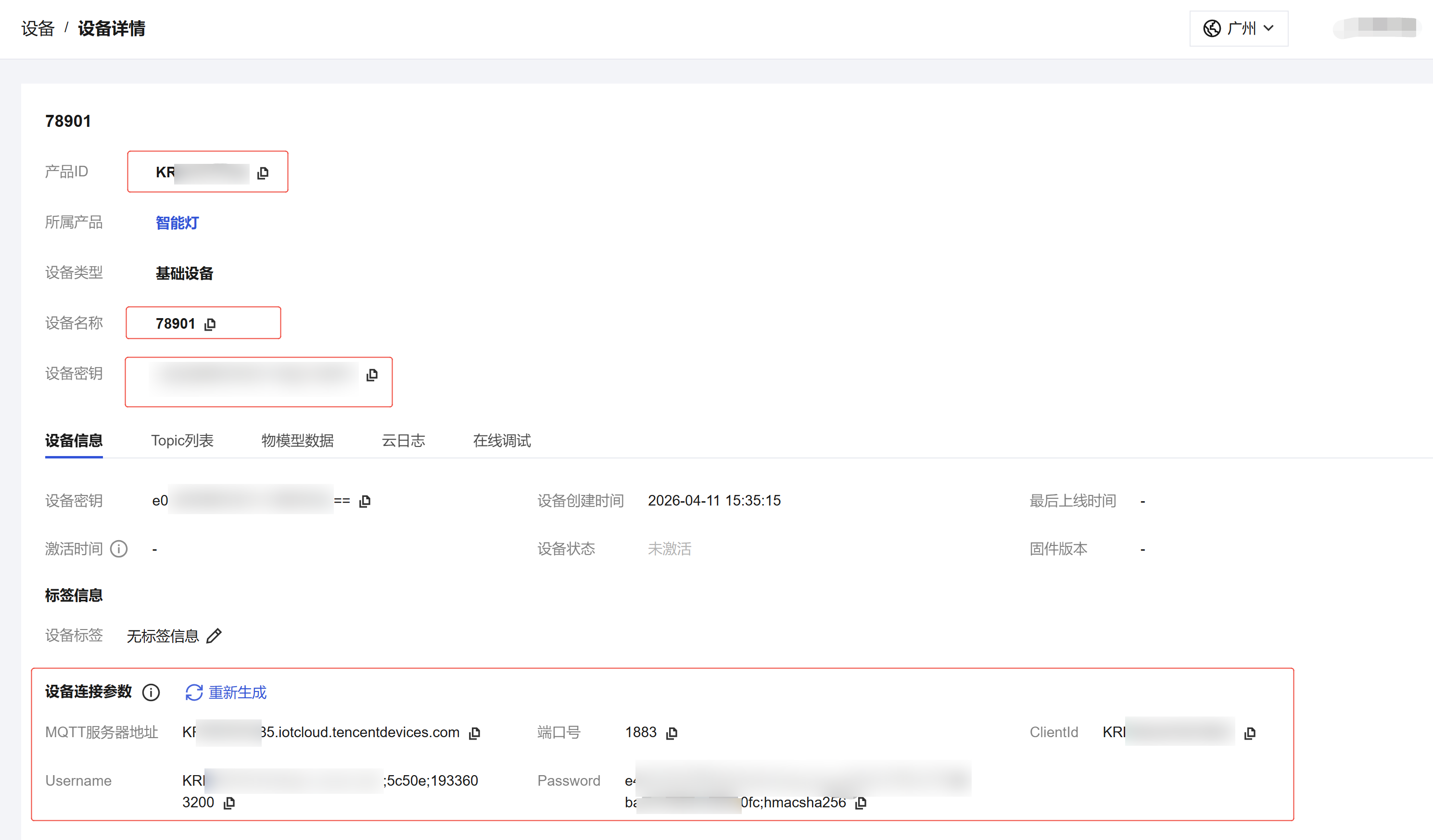 在设备列表中,单击新创建的设备操作列中的查看进入设备详情模块,可以查看到对应设备信息。系统自动根据设备三元组即产品ID、设备名称、设备密钥计算出“设备连接参数”,用户可直接复制到 MQTT 客户端工具进行连接测试。