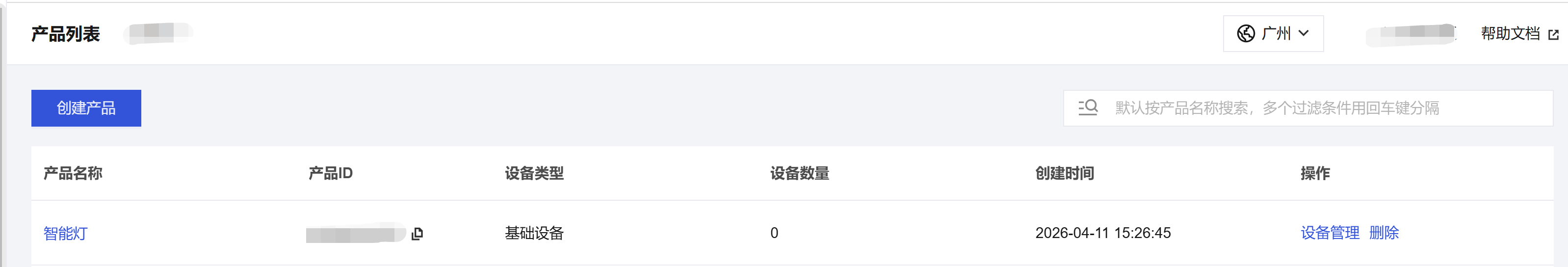 5. 产品创建成功后,您可在产品列表页查看到“智能灯”。