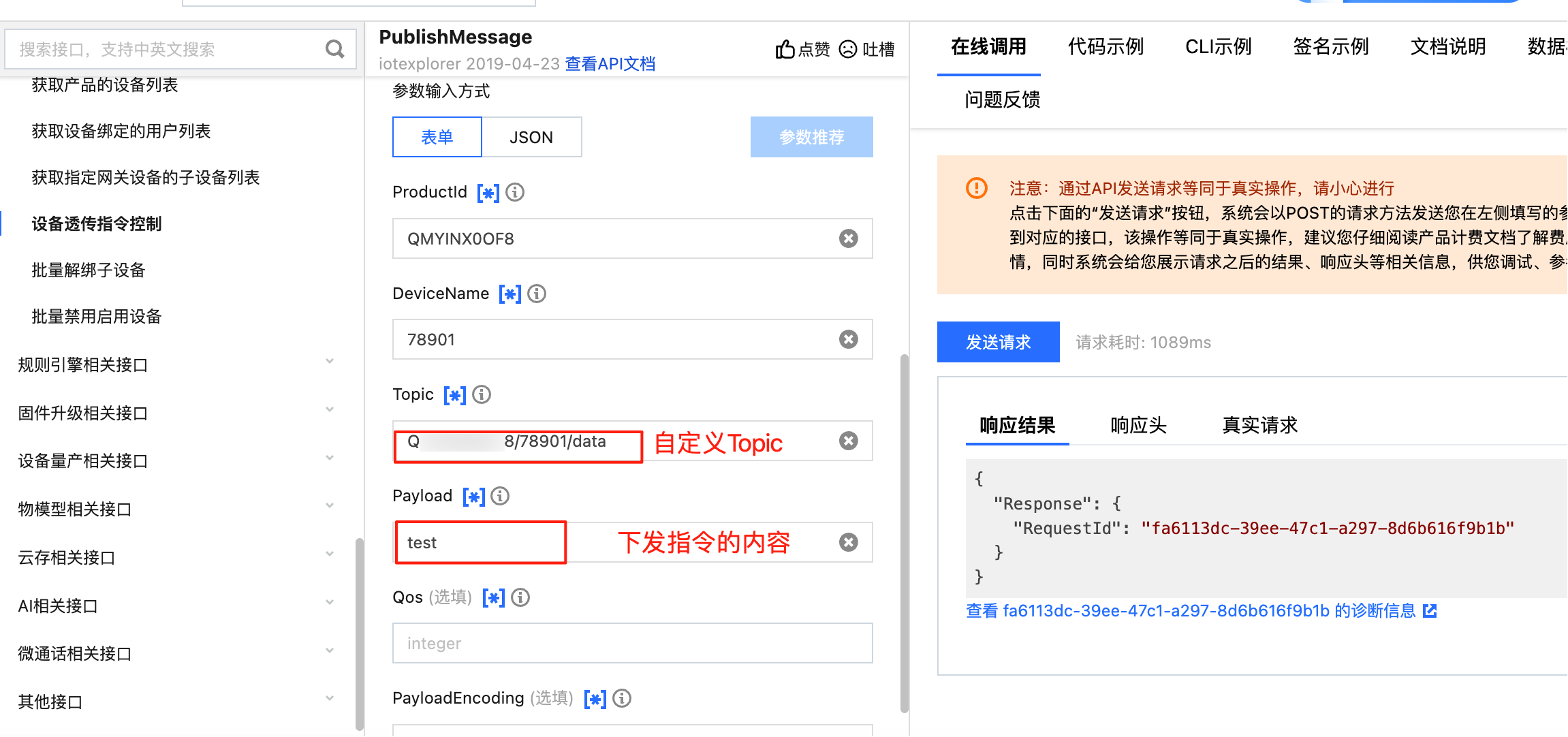 4. 打开 设备透传指令 控制的云 API 在线调试,输入对应的参数后发起调用,最后查看响应结果。若出现未订阅的报错,需要返回第3步重新订阅。