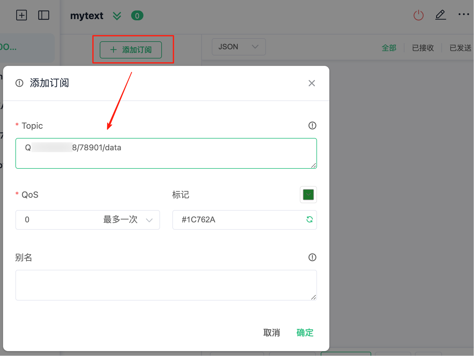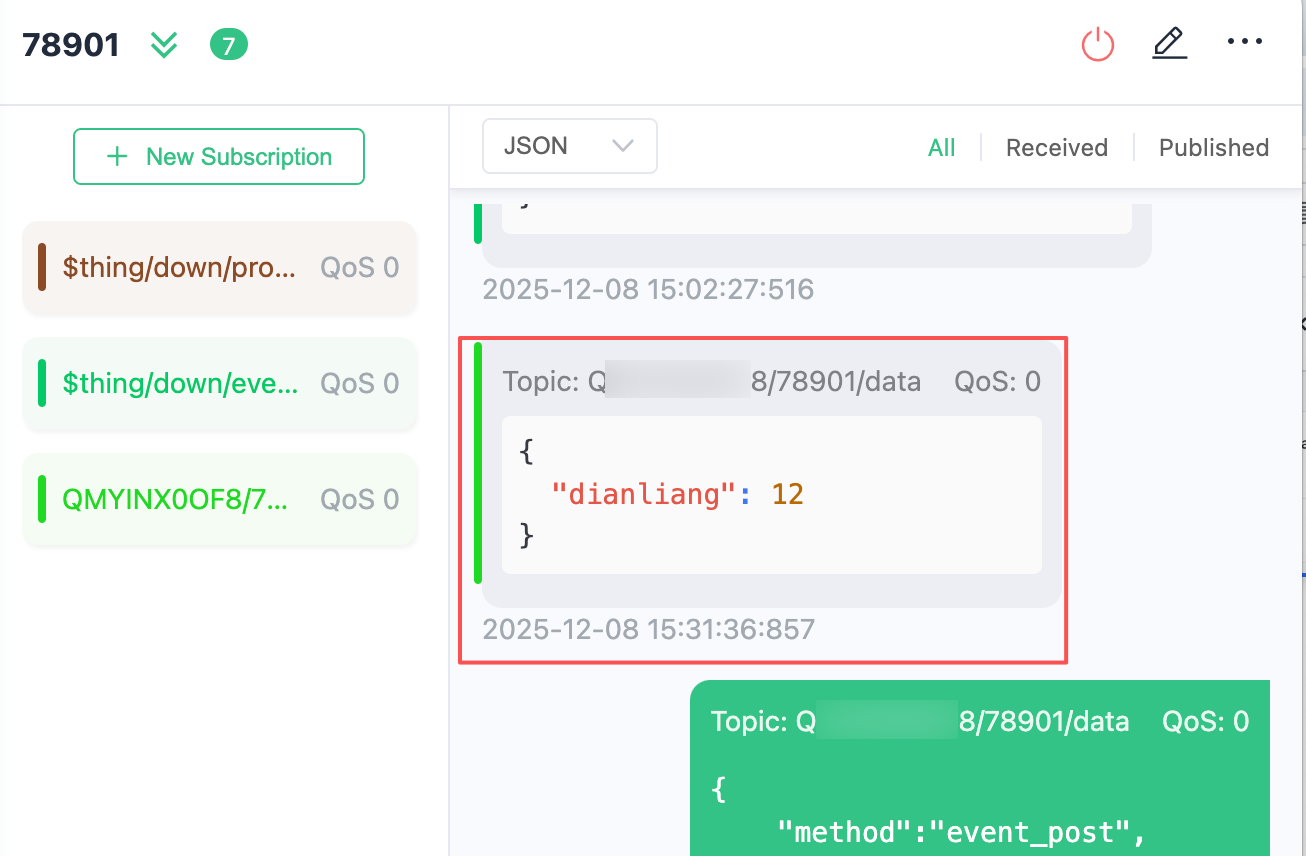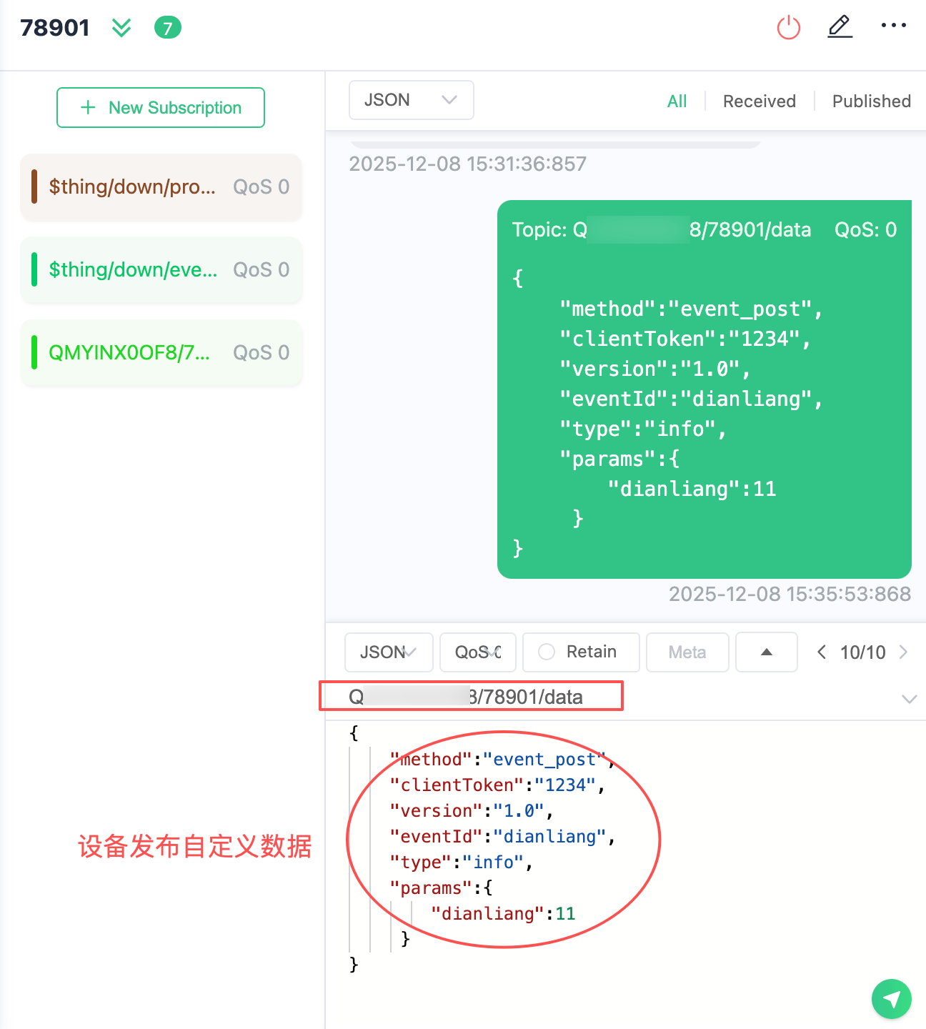 {ProductID}/{DeviceName}/data 具有发布与订阅权限,由平台为每个设备默认创建。用户订阅和发布时需将 ProductID、DeviceName 更换成用户账号下所创建的产品 ID 与 DeviceName。3. 设备在 MQTTX 工具连接成功后,需要订阅 Topic(示例:QMXXXXXXX8/78901/data)。操作时必须更换为成功通过 MQTT 身份认证的产品 ID 与 DeviceName,否则会出现无权限订阅的提示。