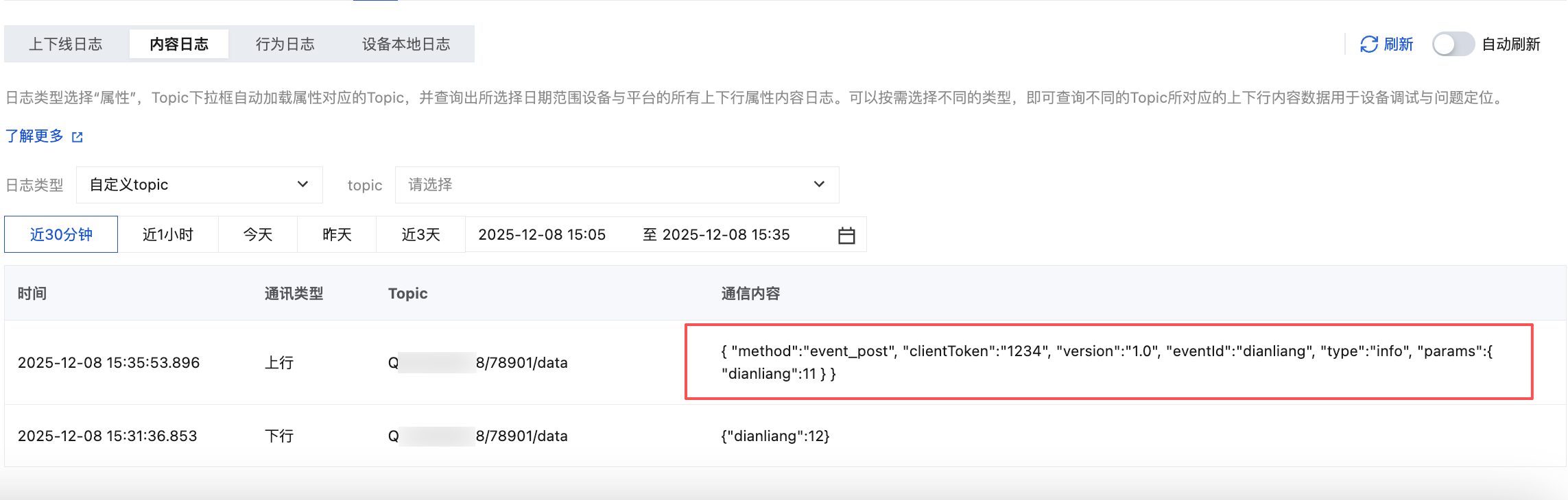 2. 若在内容日志中查到通过 MQTTX 工具发布到平台的消息内容,则表示设备发布消息到平台的操作已经成功完成。