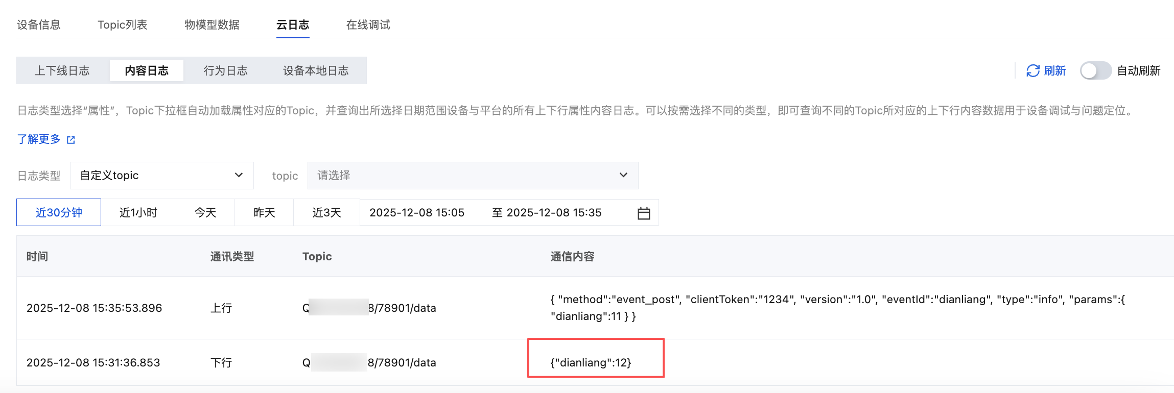 5. 发送成功后,回到控制台设备详情页的云日志 > 内容日志中验证通信内容是否有显示,同时也可以查看 MQTTX 工具中订阅的自定义 Topic 是否有收到下发的内容指令。当在控制台查看有下行类型的日志,且内容与远控 API 的消息内容一致,或者 MQTTX 工具能显示接收到的消息,表明远控消息成功下发到设备。