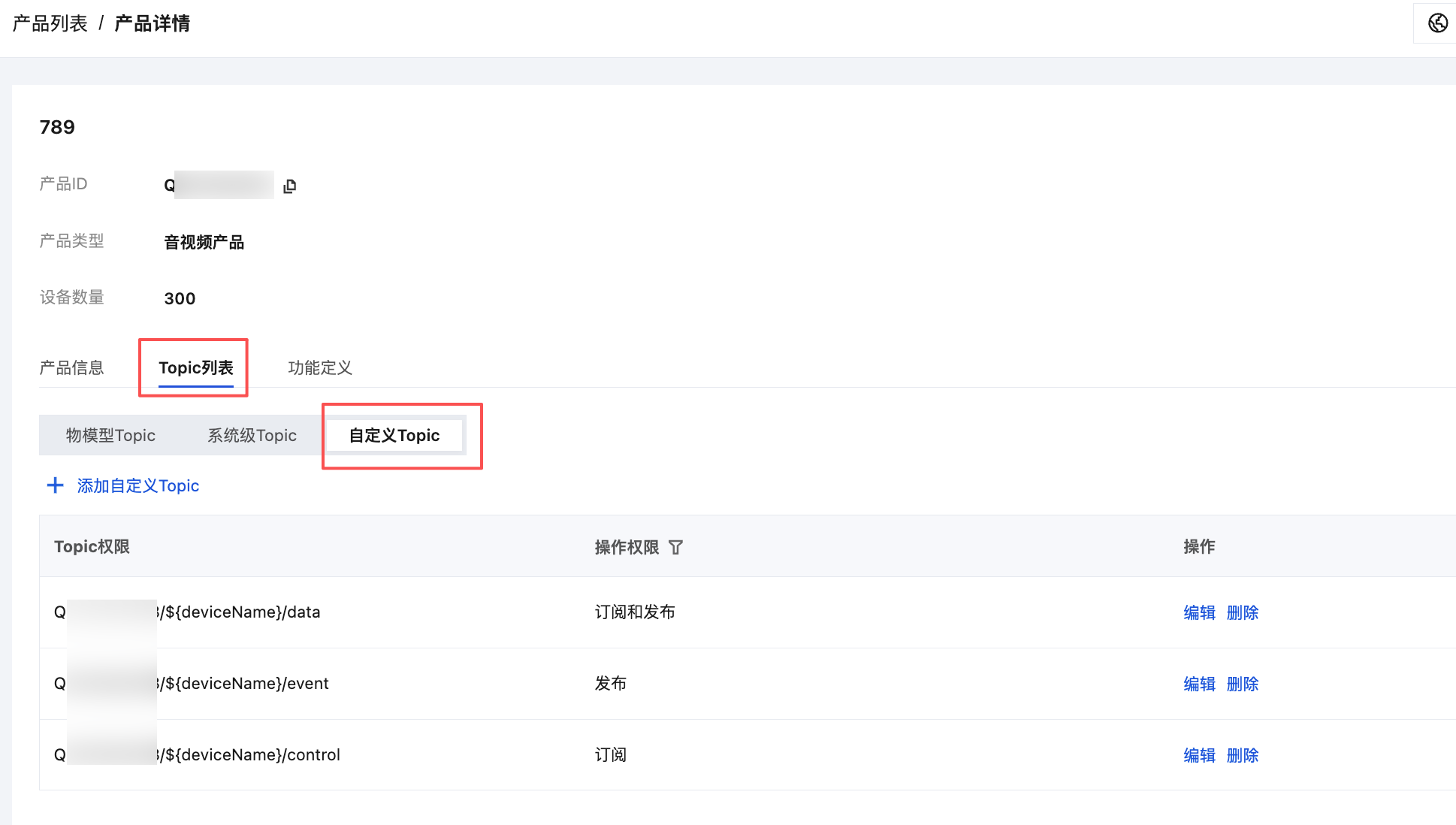 2. 在 Topic列表 > 自定义 Topic 中找到当前设备的自定义 Topic。