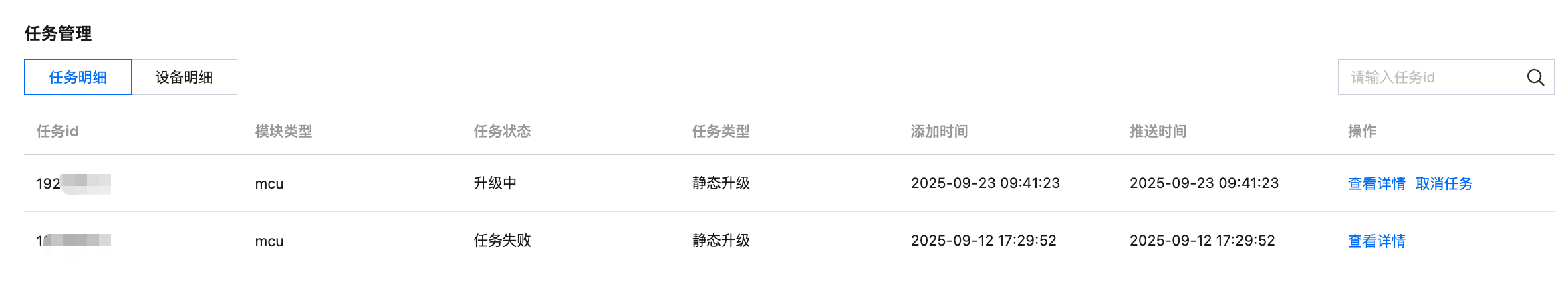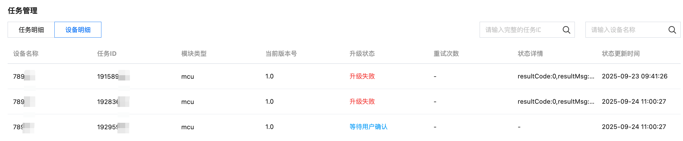 单击任务明细,可查看该升级包的全部升级任务。升级任务的任务状态包含4种:待升级、升级中、任务成功、任务失败。