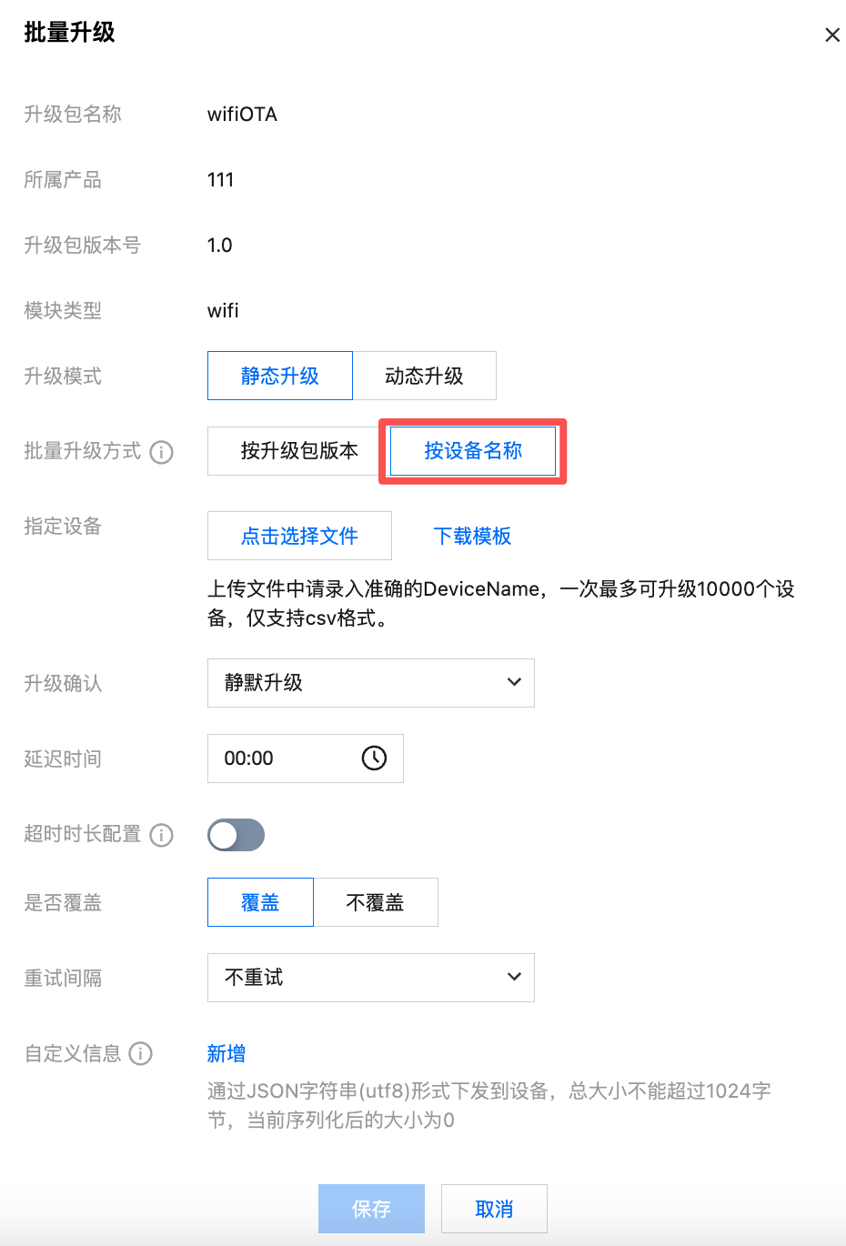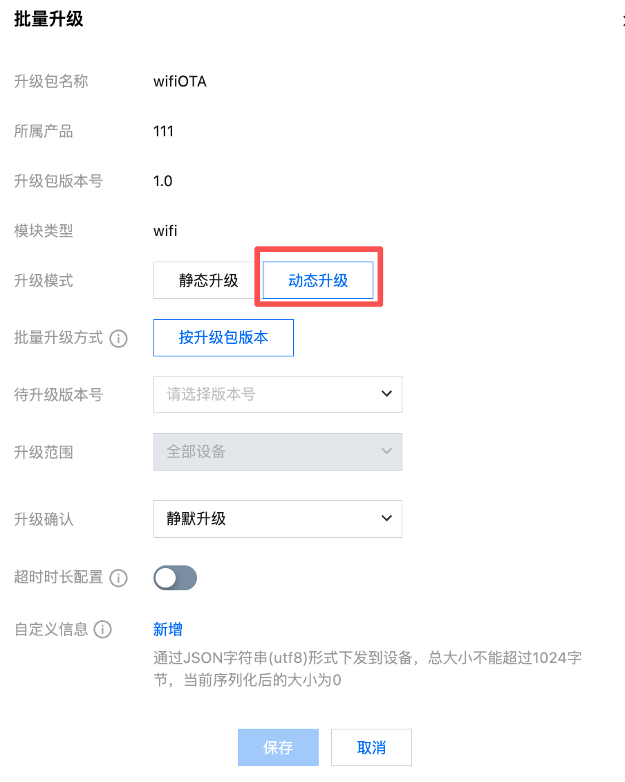 超时时长配置 | 当云端超过超时时长没有收到设备升级包升级消息时,则会重新下发升级包升级任务。静默升级超时时长默认为15分钟。用户确认升级超时时长默认为2分钟。您也可以根据业务实际需求自定义配置。 |