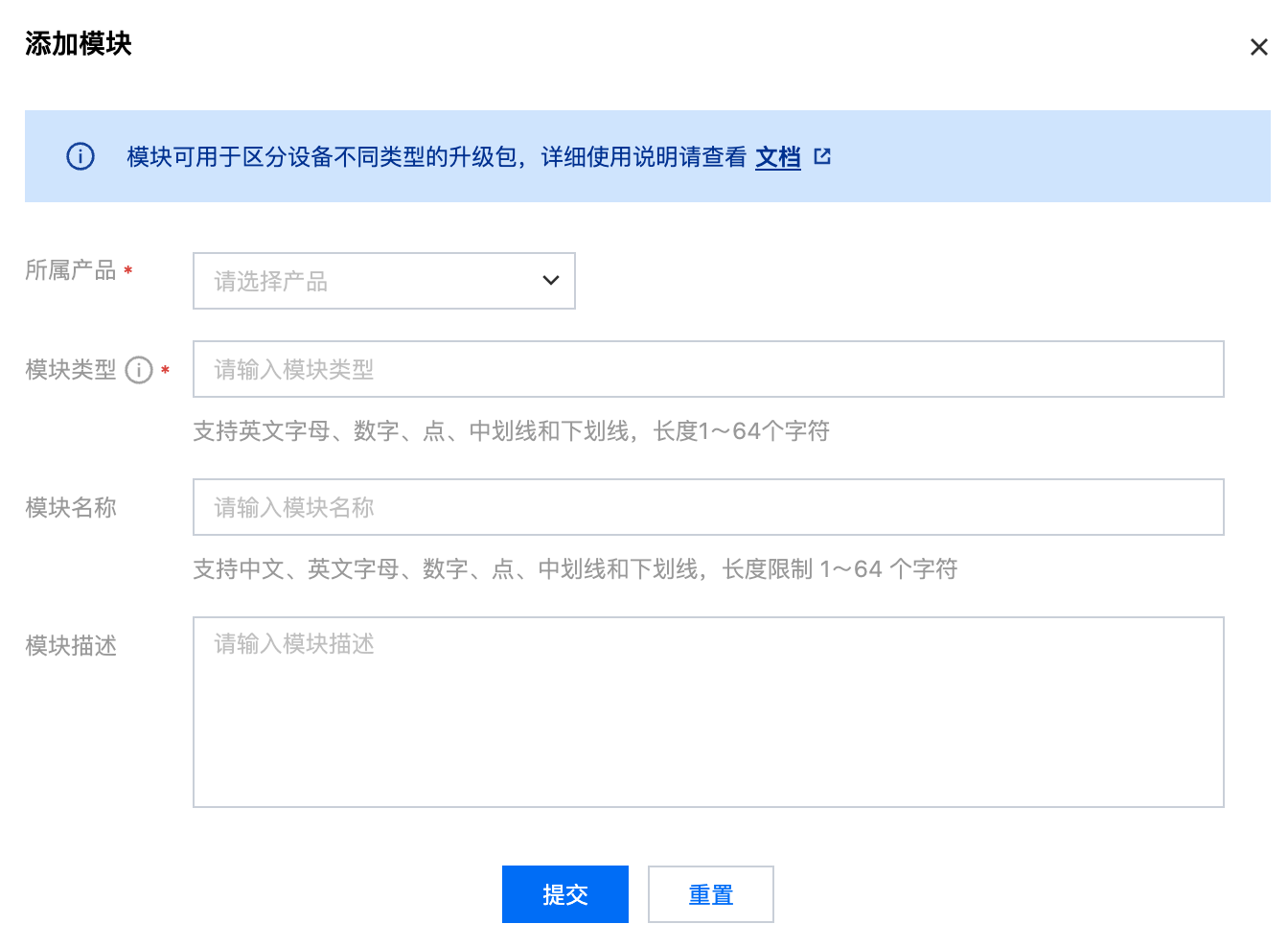 模块类型:必填,在所属产品下新增模块类型,创建后不可修改。