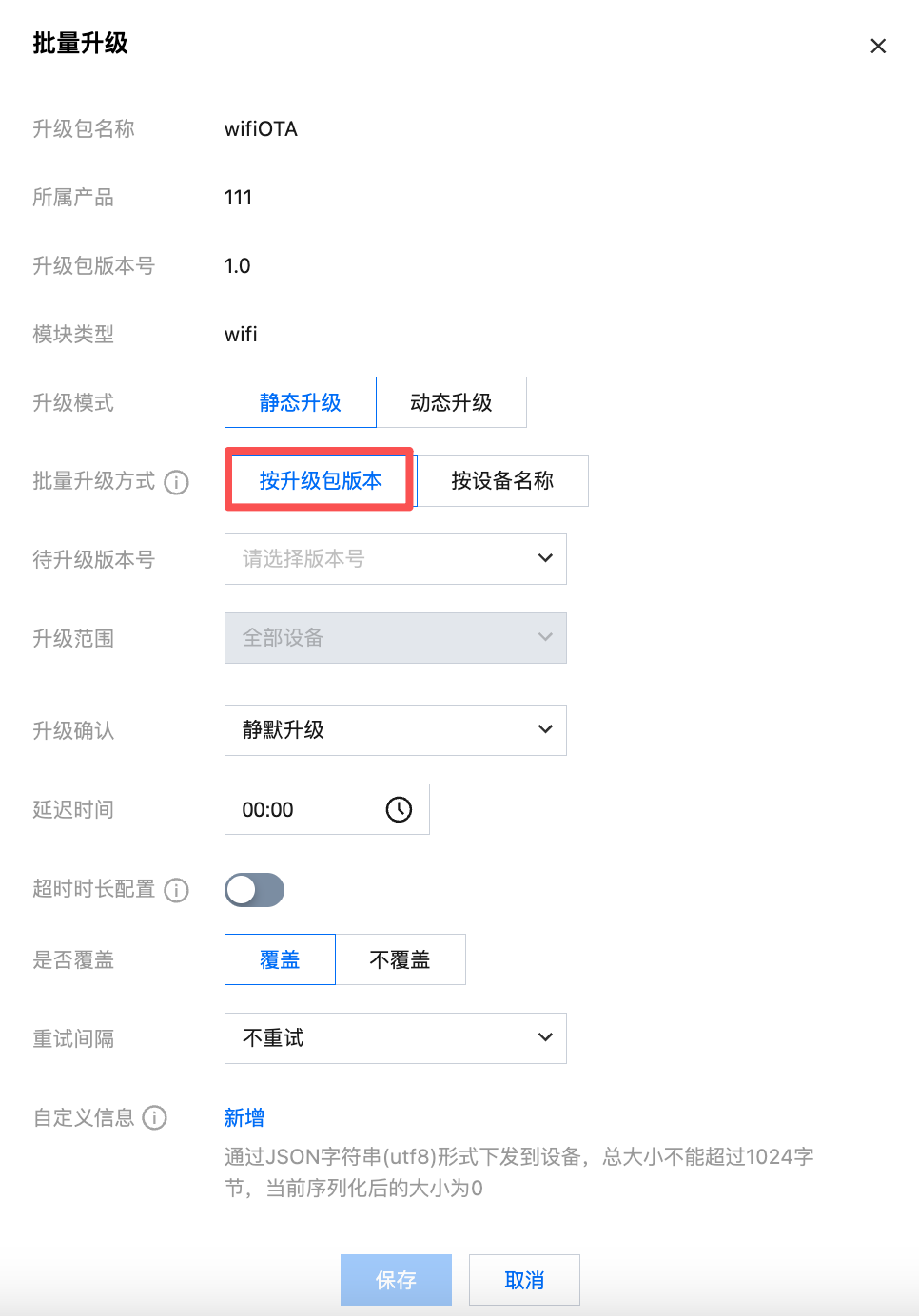 自定义信息 | 可选。创建升级任务后,自定义信息会在升级通知中发送至设备。通过 JSON 字符串(UTF-8)形式下发到设备,总大小不能超过1024字节,当前序列化后的大小为0。 |