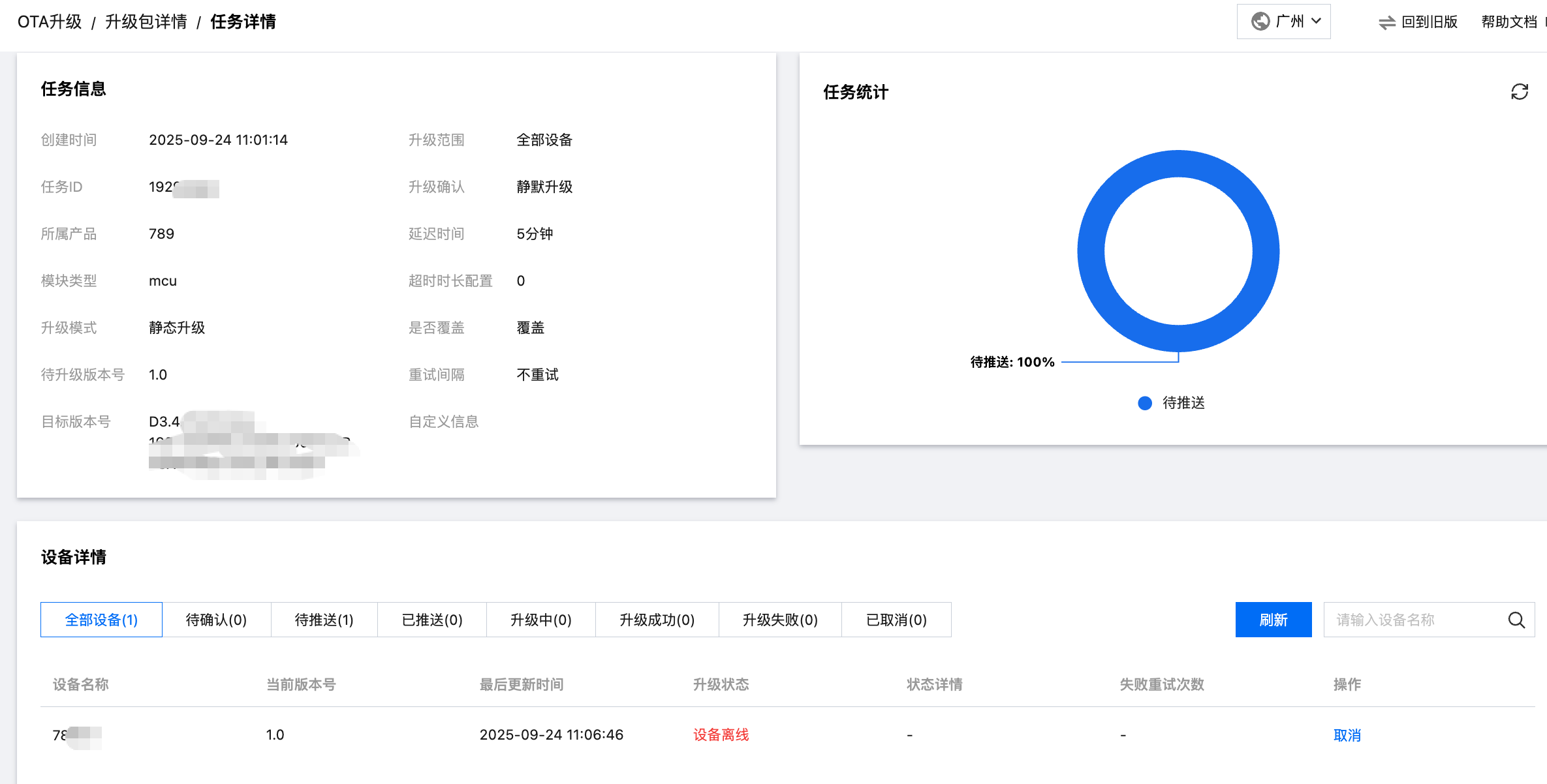 3. 在任务管理的任务明细,单击某次任务右侧的查看详情,进入任务详情页,可以查看此次任务升级的设备清单、升级状态以及不同升级状态的设备数量统计。