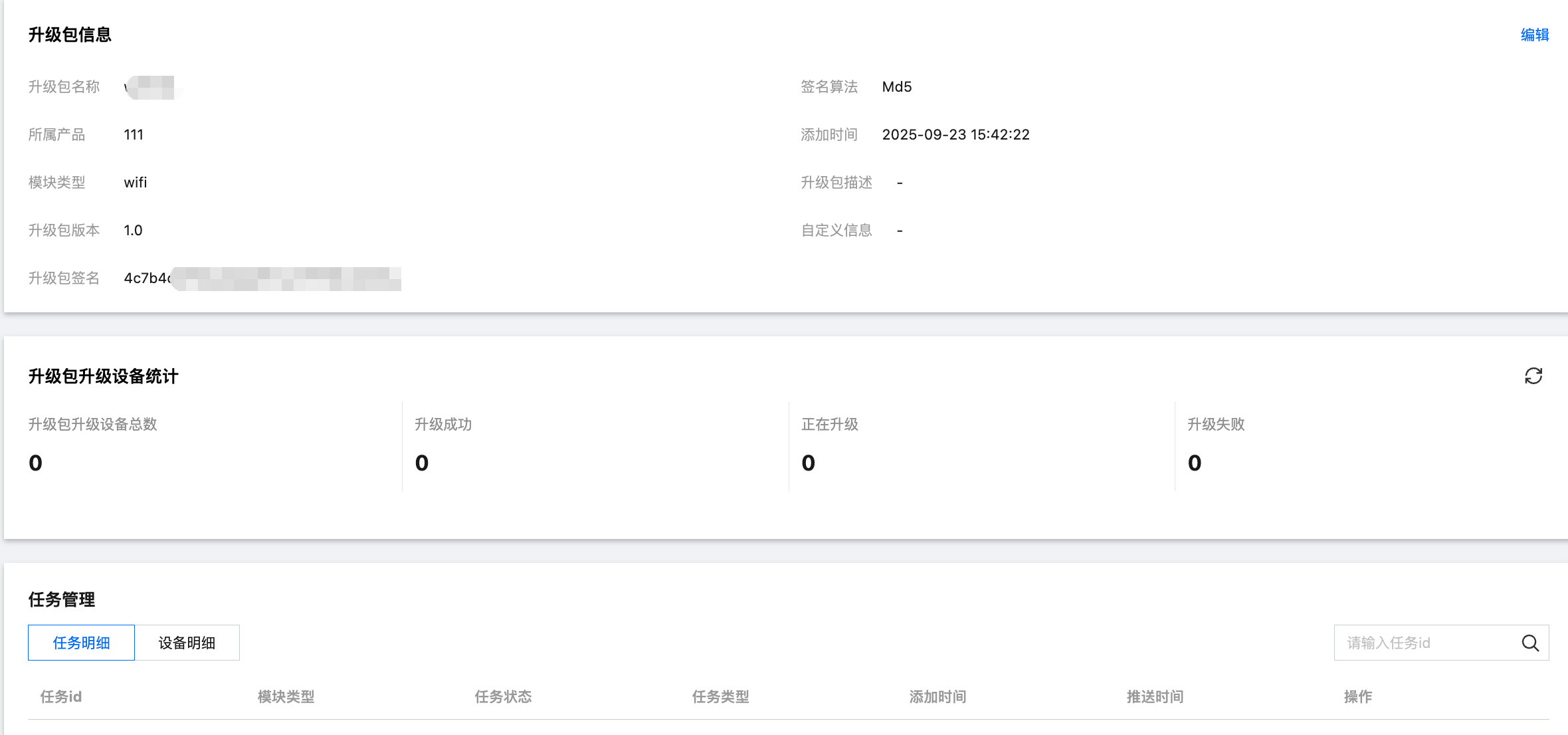 2. 进入升级包详情页,可查看该升级包任务的详细信息、升级包升级设备统计和升级任务管理列表。