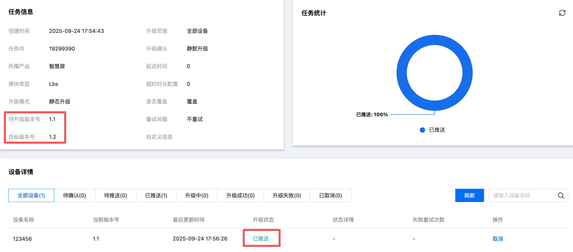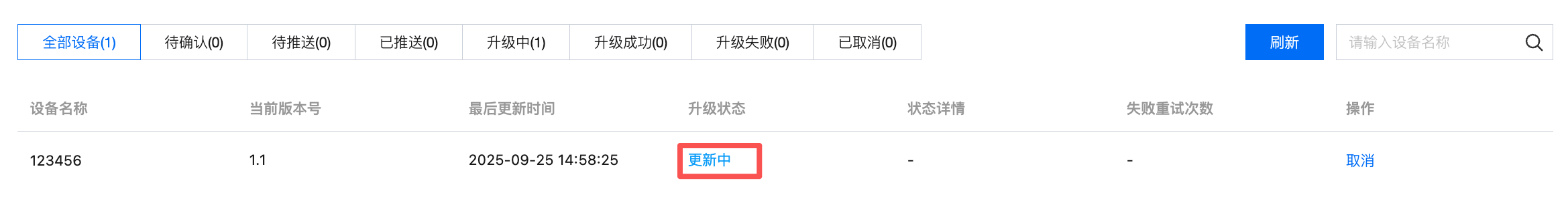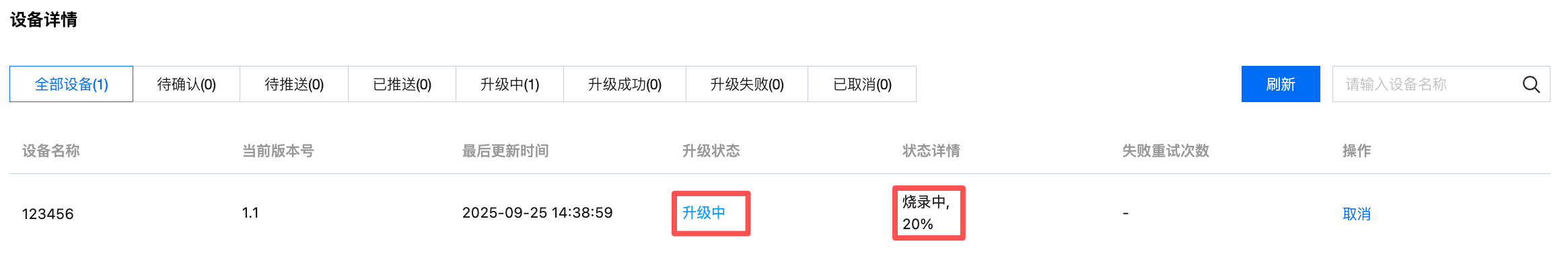这里以静默升级模式来给设备1.1版本升级到1.2版本为例,若升级状态显示“升级失败”则需检查设备是否在线。排查故障后可点击取消后重试平台会再次推送。