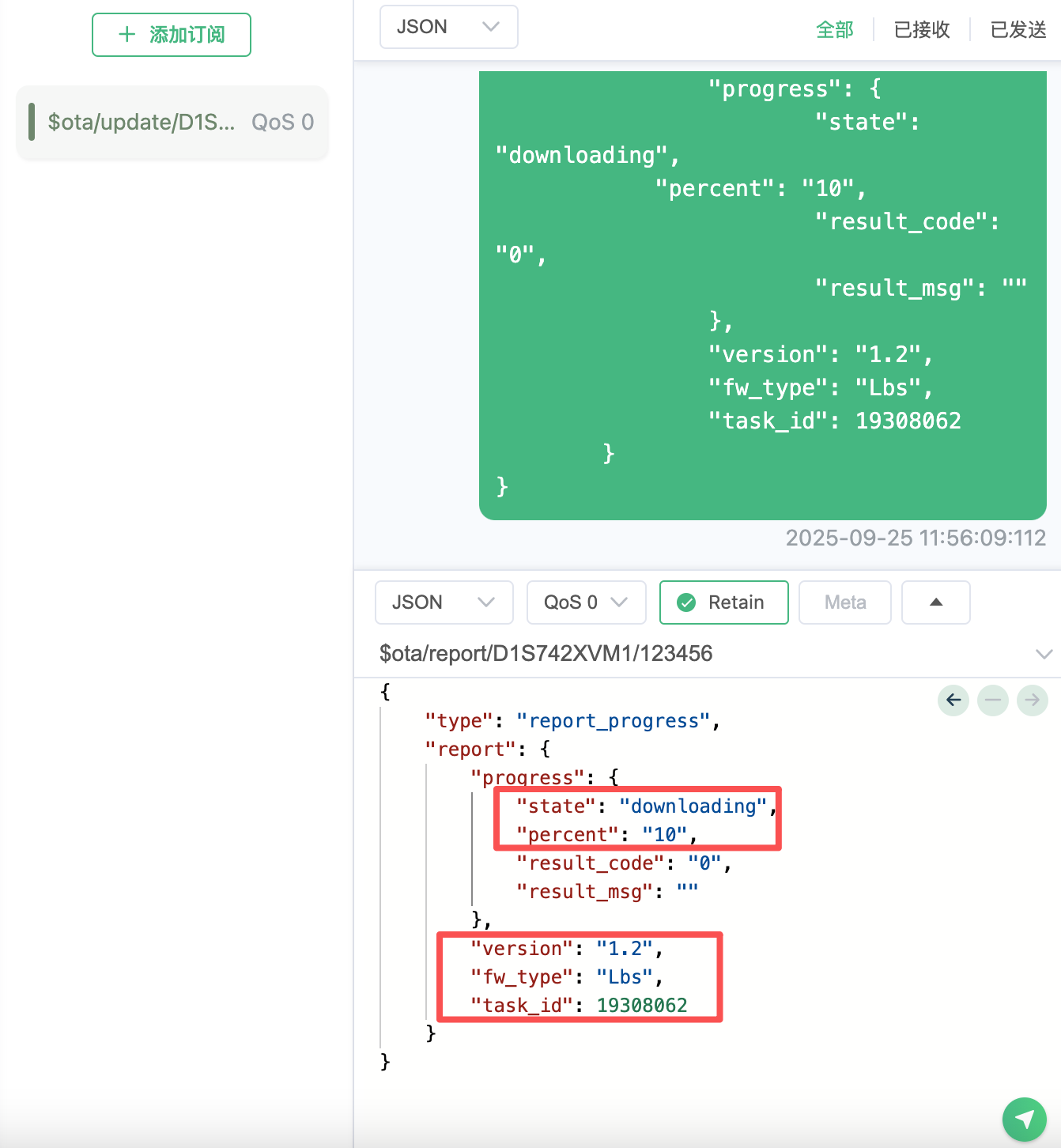 在 MQTTX 工具中可查到平台下发至设备的升级任务消息。