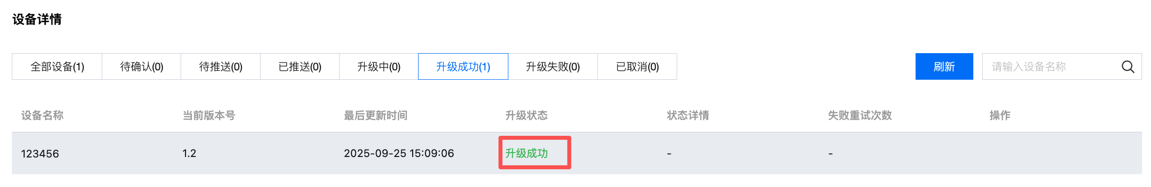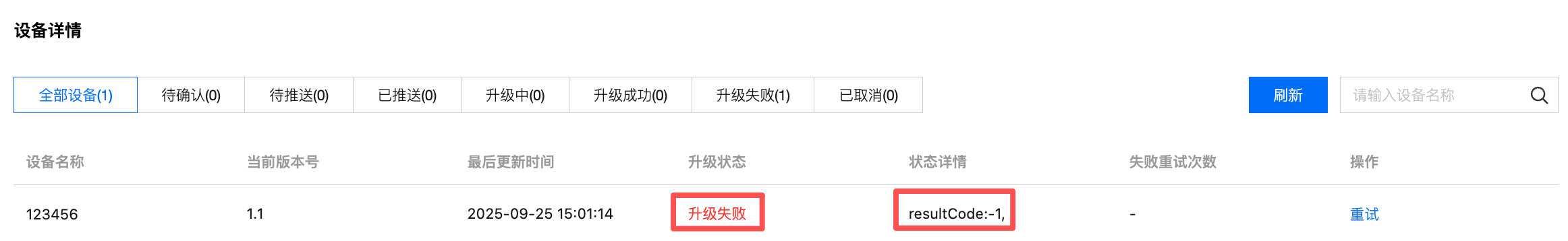 当升级任务显示“升级失败”时,设备根据错误码排除问题后,可在设备详情 > 升级失败 > 找到对应设备 > 操作重试。平台会继续给当前设备下发升级包,设备可继续走升级流程。
