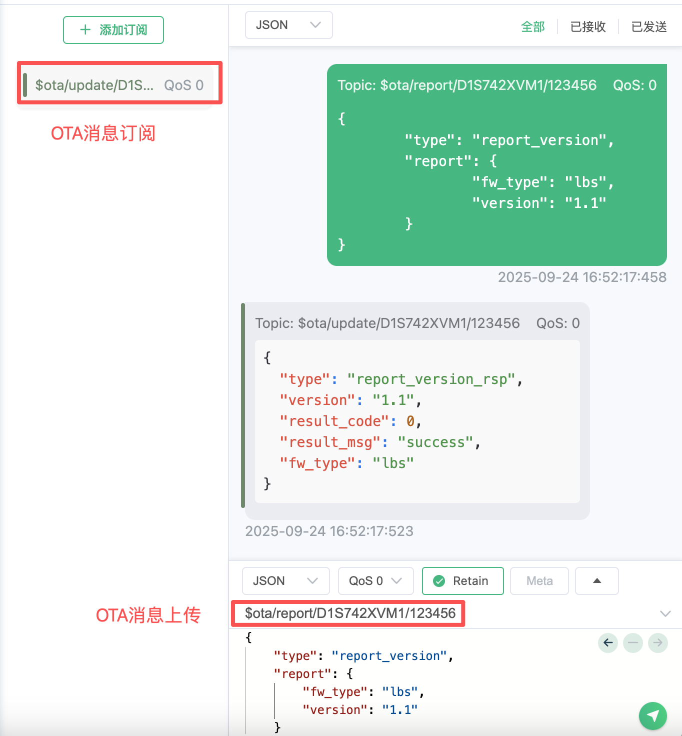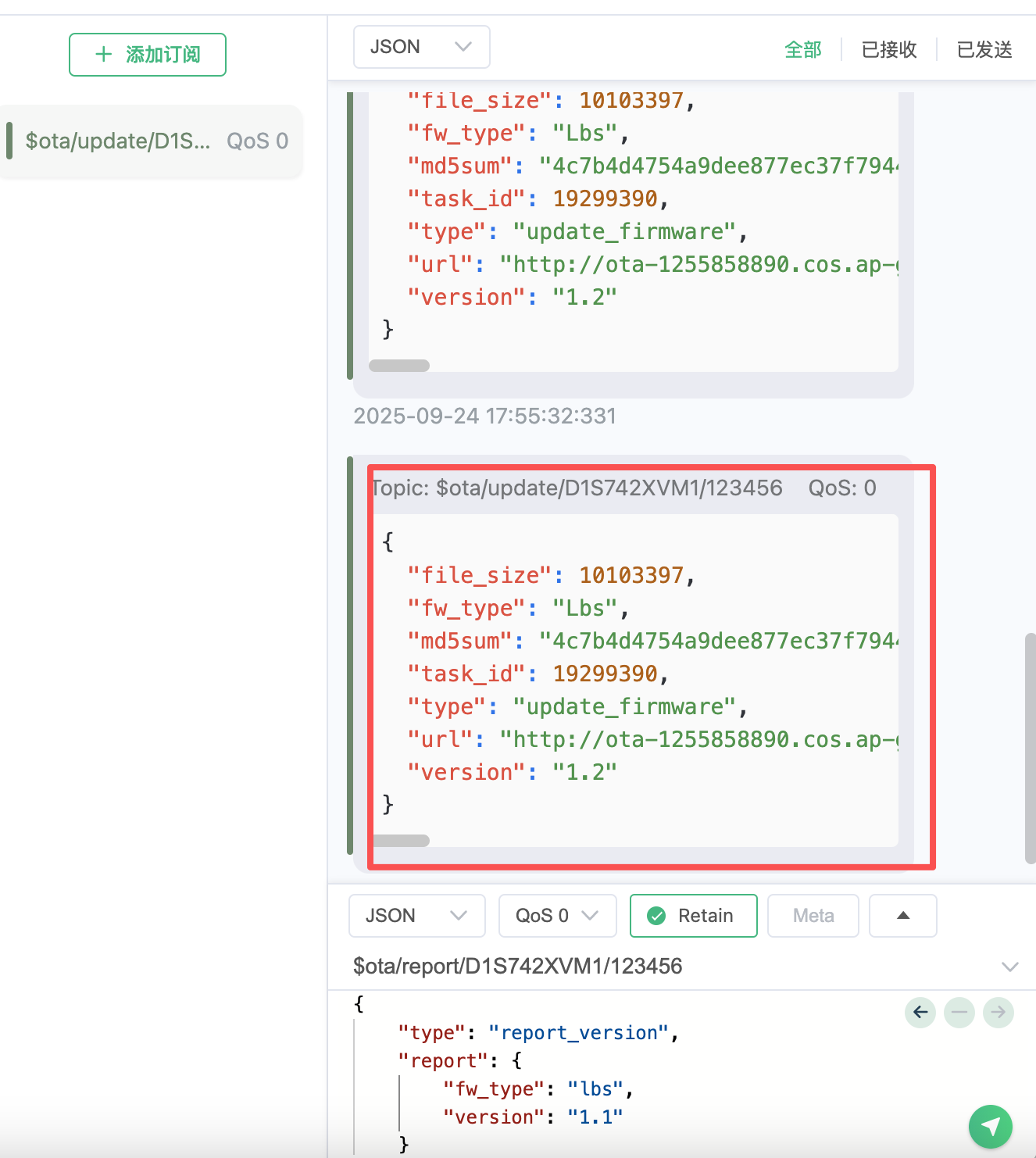 设备启动后,通过 MQTT 协议向 Topic: $ota/report/D1S742XVM1/123456 上报当前固件版本,这里需要同时订阅版本上报回复的 Topic:OTA$ota/update/D1S742XVM1/123456