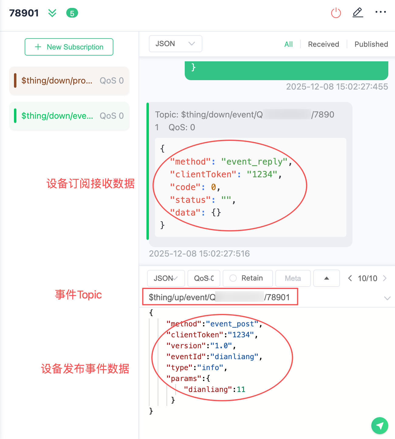 3. 当 MQTTX 连接成功后,需要在 MQTT 工具内订阅物模型事件下行Topic。