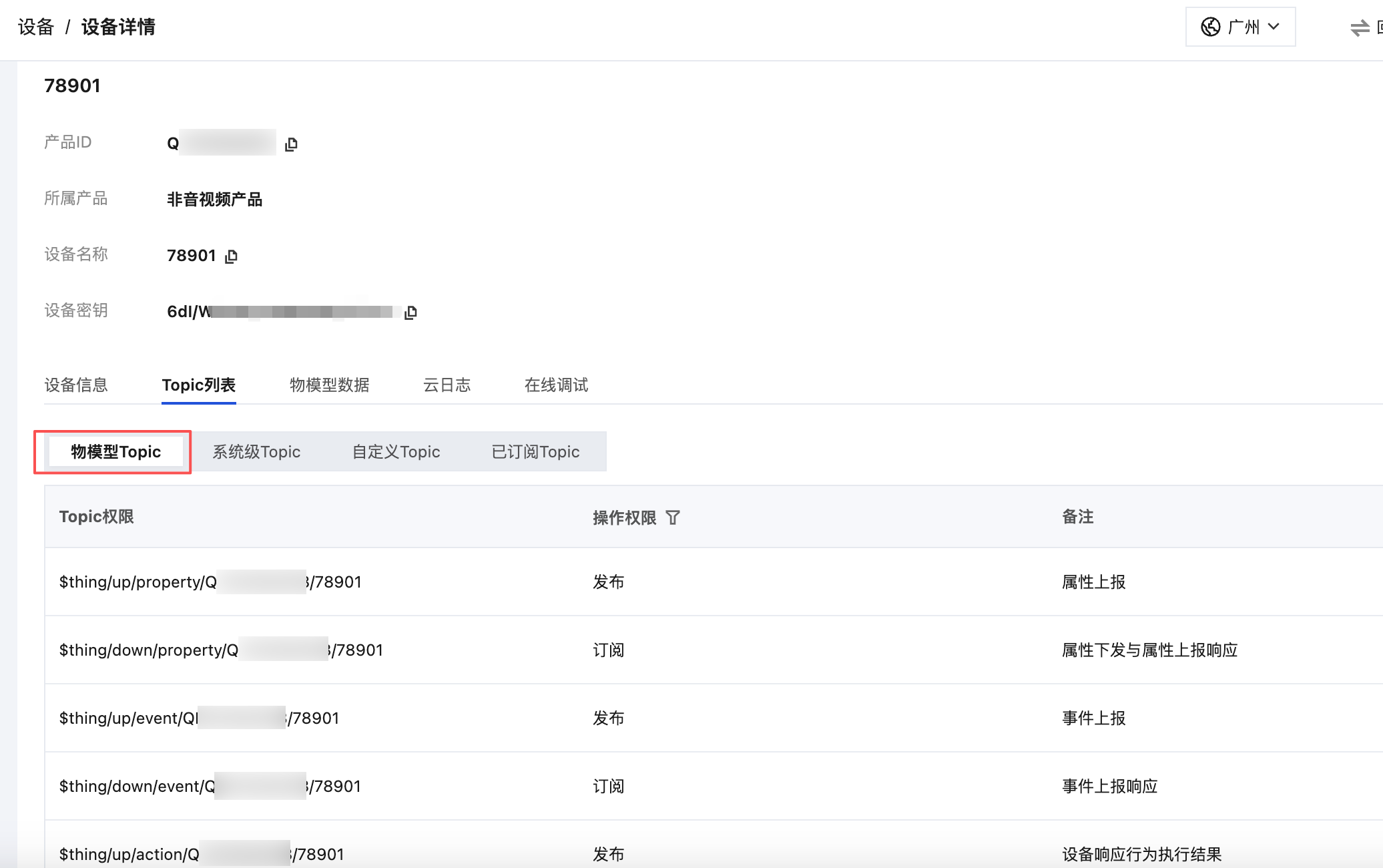 2. 在 Topic 列表查看当前设备的物模型(属性/事件/行为)Topic。