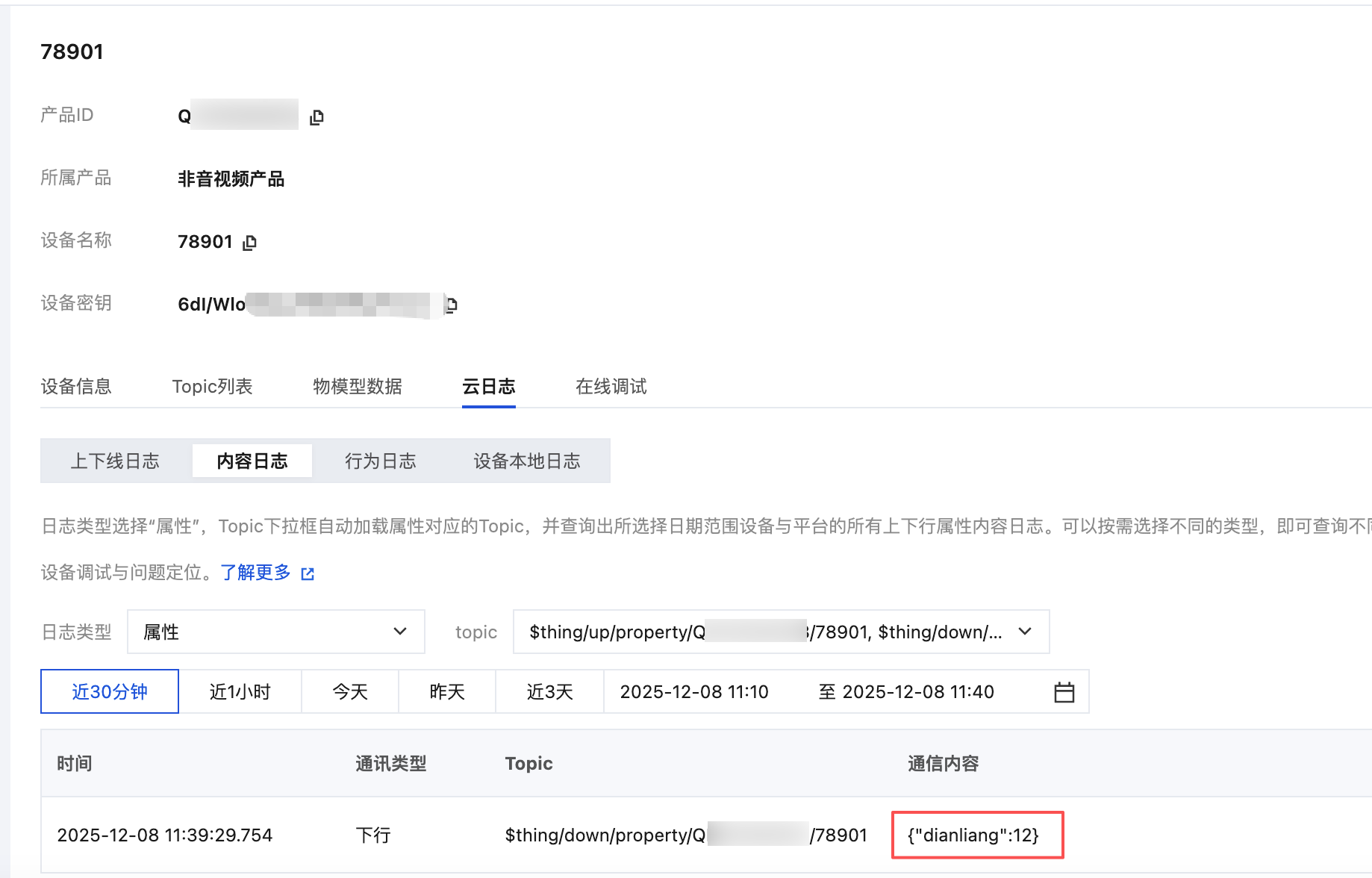 5. 发送成功后,返回至设备详情页的云日志 > 内容日志中验证通信内容是否有显示。