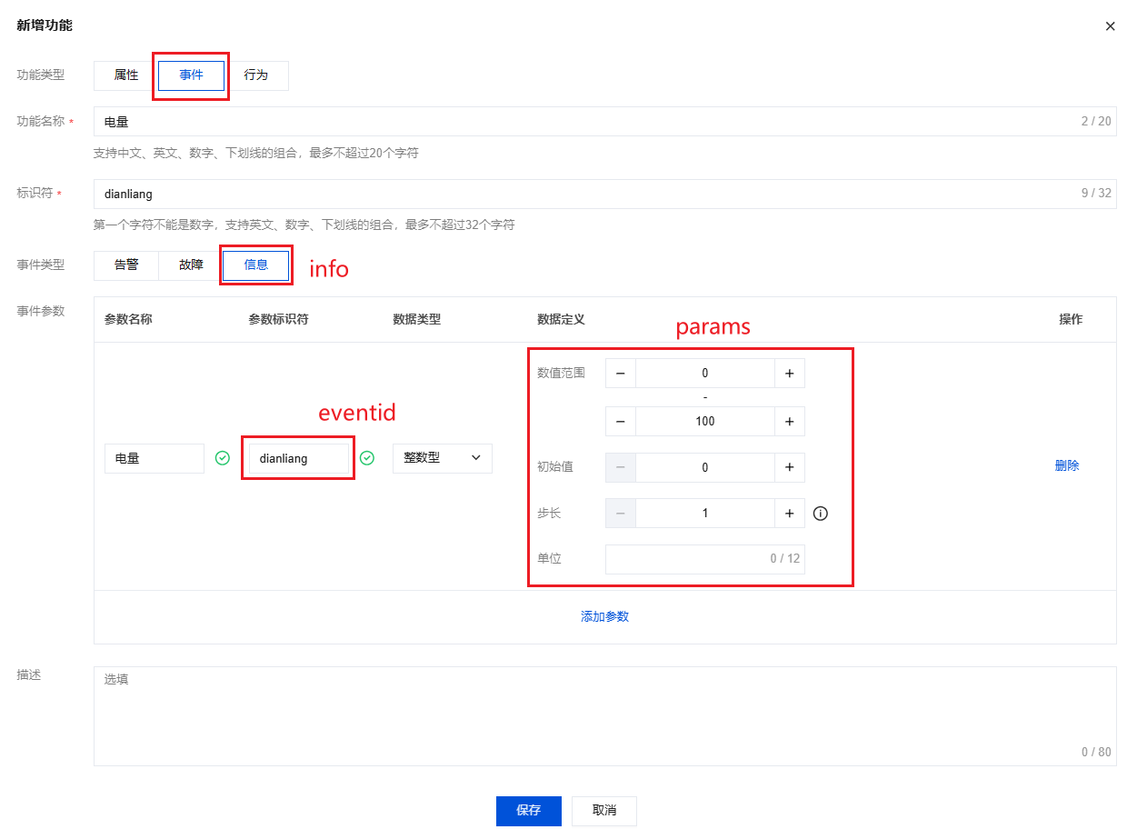 2. 在物模型定义中添加事件类型的标识符。以定义一个电量信息的标识符为例: