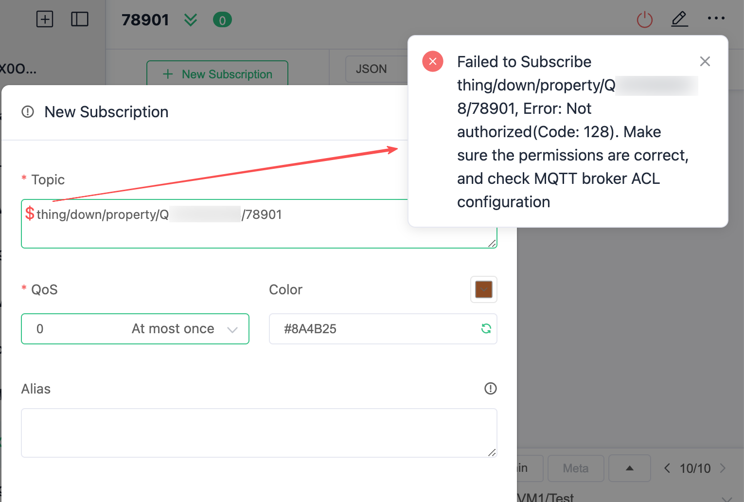 MQTT 工具提示无法订阅 Error:Not authorized(code:128),表示 Topic 字符串有误,需要检查是否添加“$”符号。