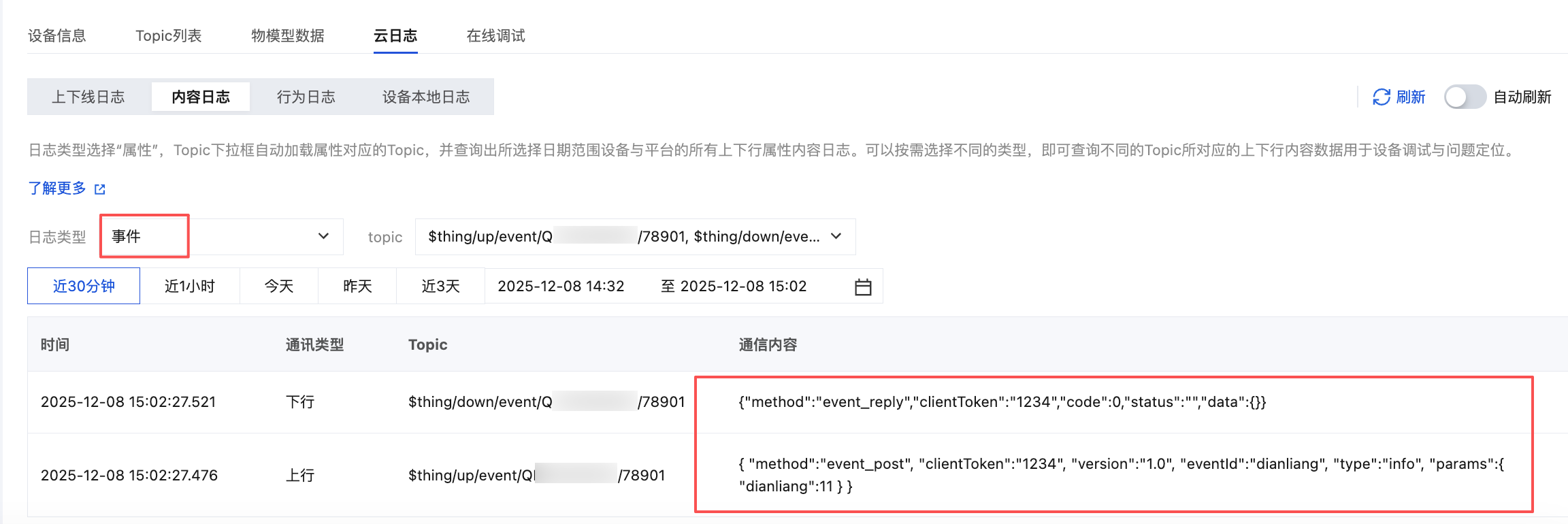 4. 可在设备详情页的云日志 > 内容日志的事件日志查看通过 MQTTX 工具上报的指令,以及 Topic 通信内容。