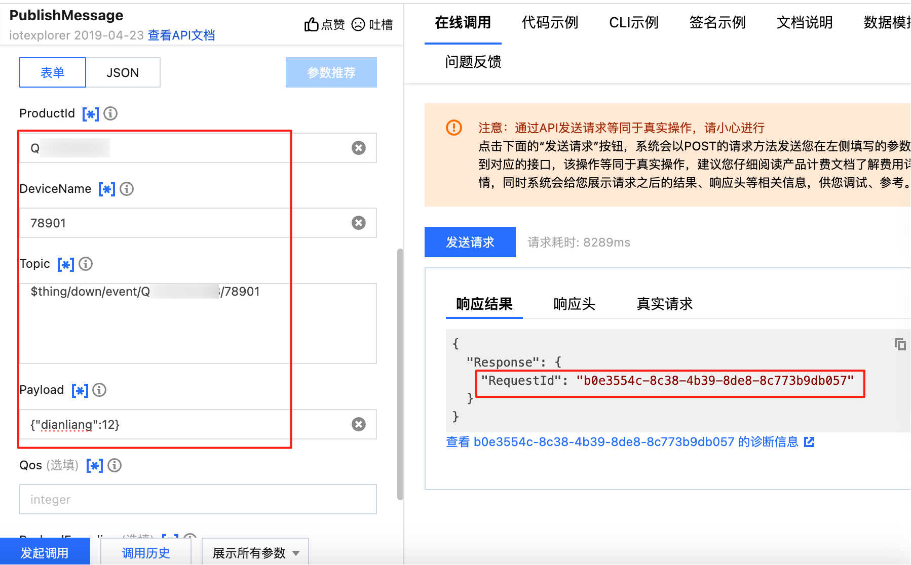 若发送请求返回提示“消息发送失败,设备未订阅Topic”,则需回到第3步重新订阅。