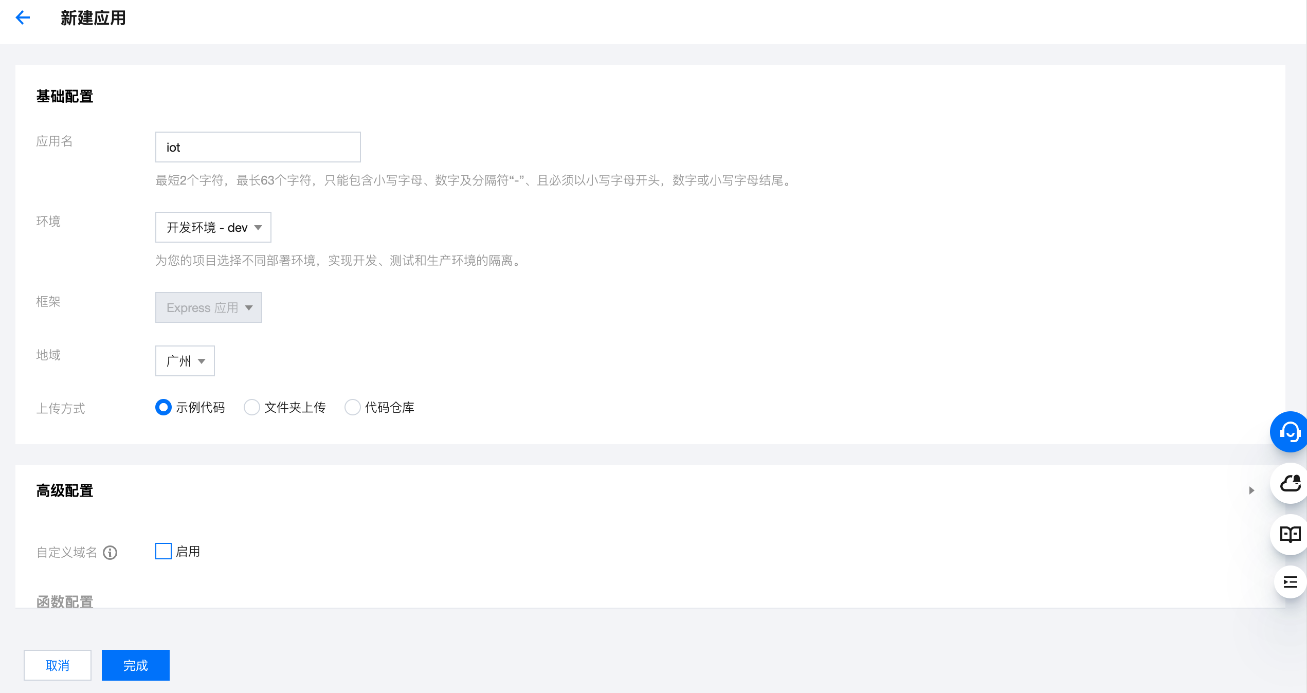 3. 输入应用名,选择环境、地域和上传方式。配置结束后单击完成。