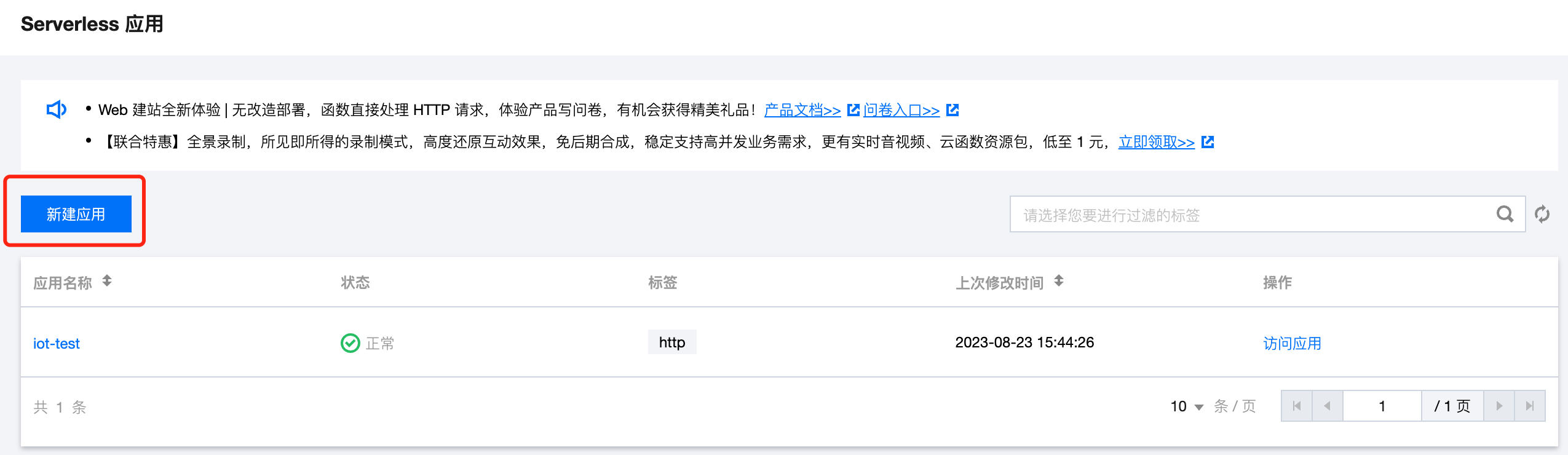 1. 登录 SCF 控制台,选择 Serverless 应用,单击新建应用。