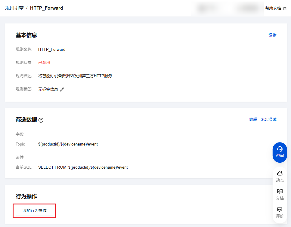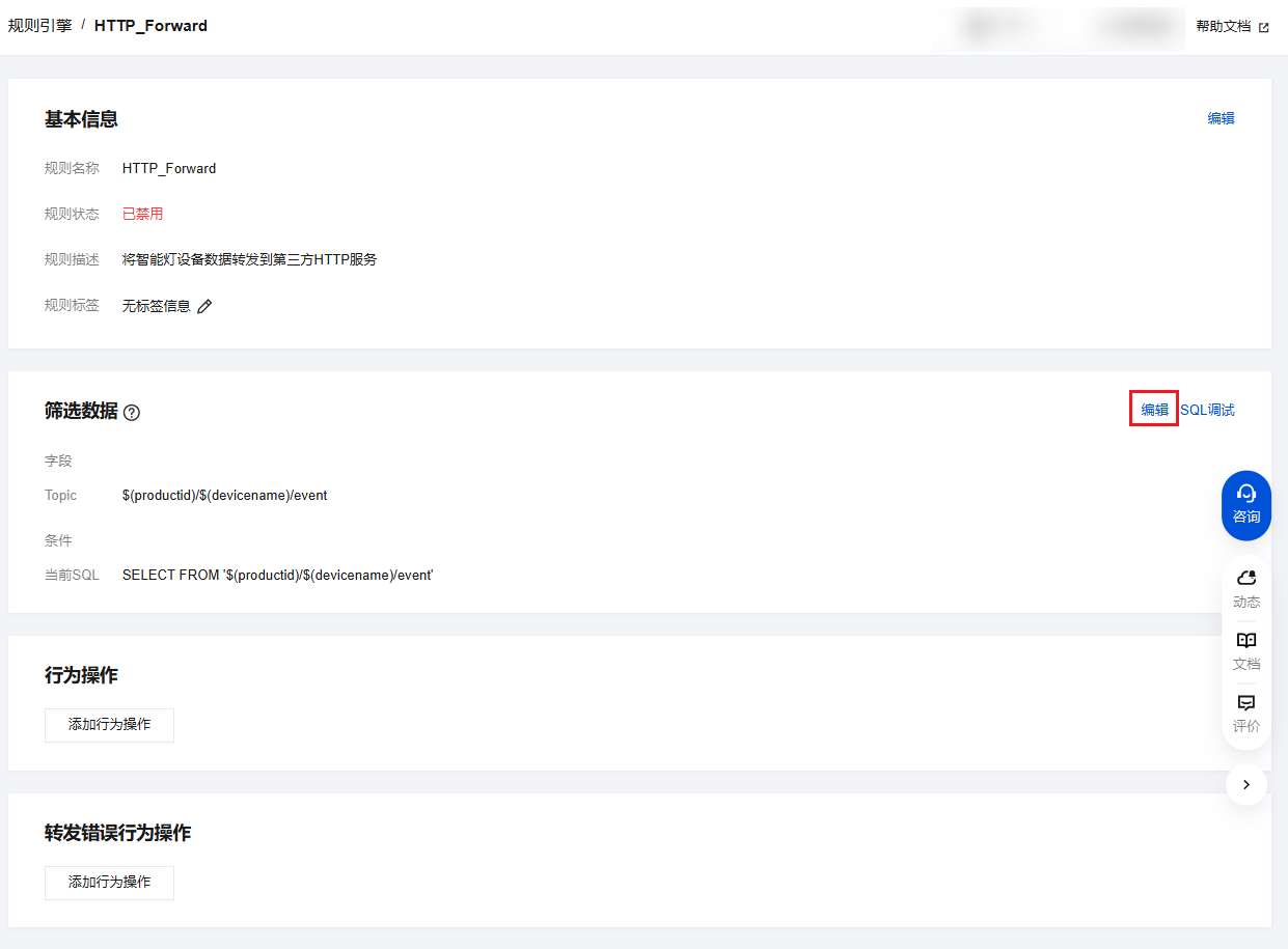 1. 在规则引擎列表选择刚创建成功的规则 HTTP_Forward,单击规则名称或操作列中的管理,进入规则引擎配置页面。