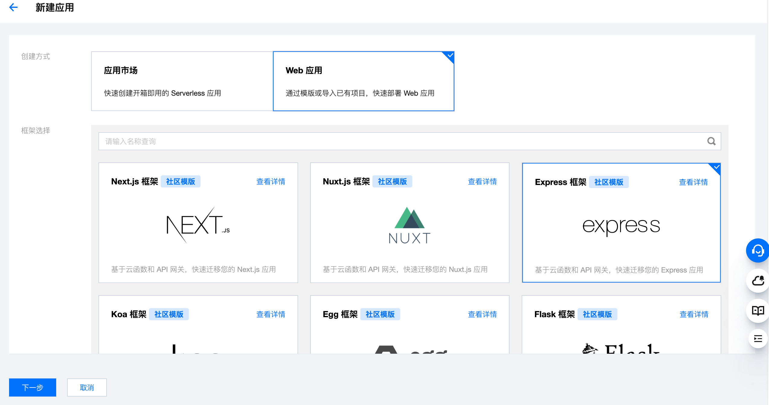 2. 选择 Web 应用下的 Express 框架模板,单击下一步。