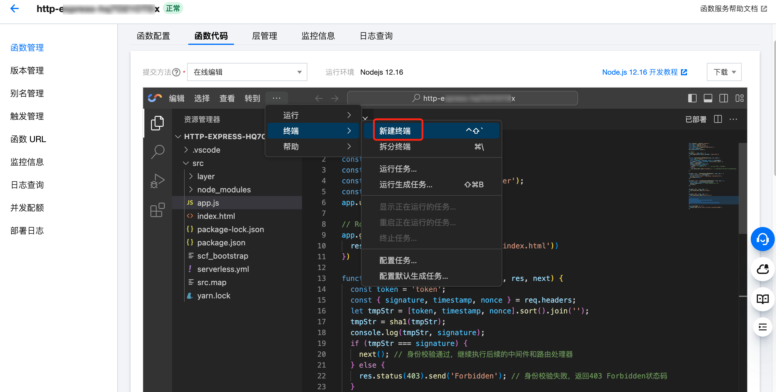 5. 在函数服务中,单击 app.js,删除原来的代码,复制示例代码到