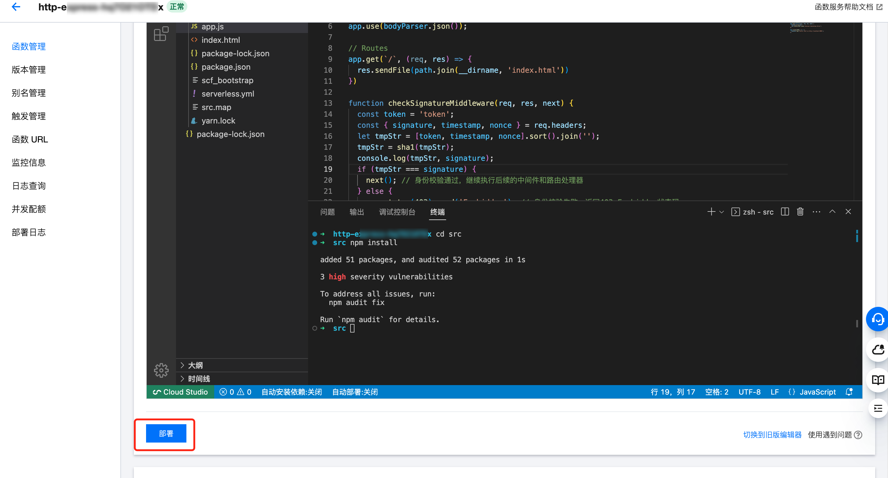 7. 等待依赖安装完成之后,单击下图红色线框中的部署,即可成功部署 Web 服务,SCF 会自动启动该 Web 服务,约5秒 - 10秒后系统会提示“部署成功”。