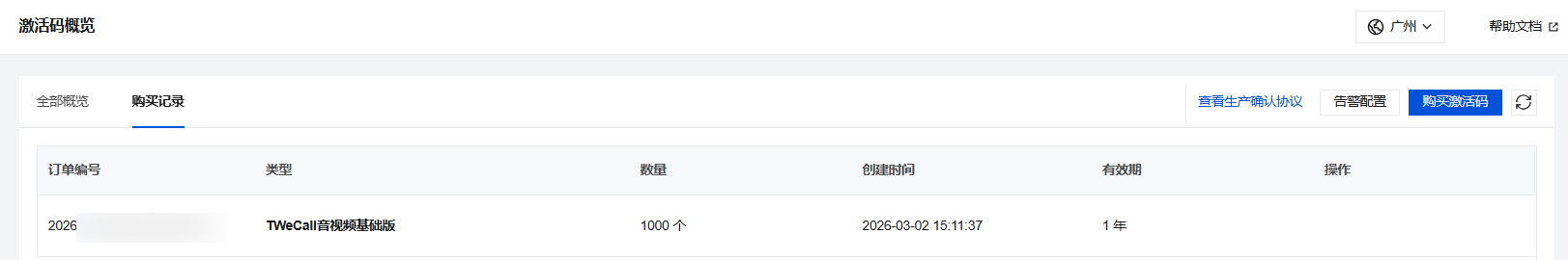 2. 在单独购买微信通话(TWeCall)激活码的购买页面,生效地域选择广州。