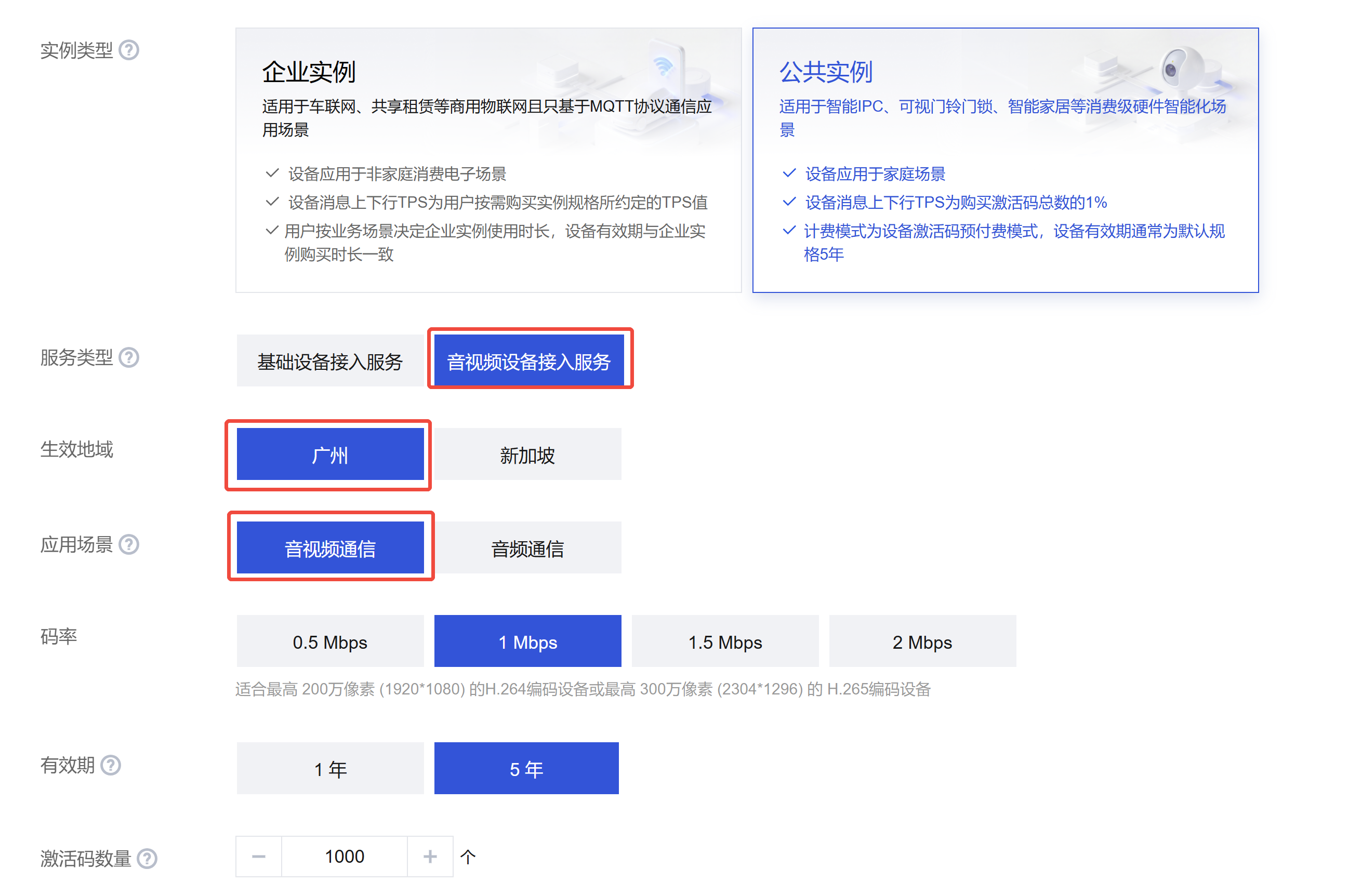 3. 根据您的设备场景选择“音视频设备接入服务”对应规格。若您的音视频设备需要微信通话(TWeCall)功能,则可选择加购微信通话(TWeCall)激活码。