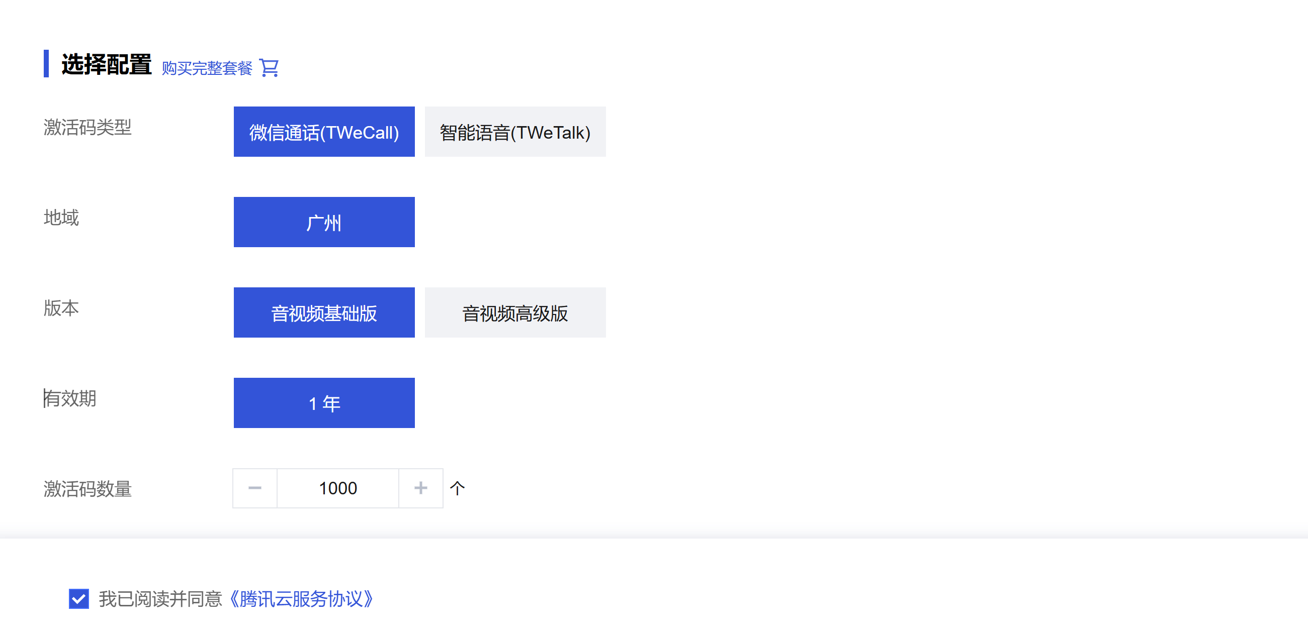 如果您已购买过音视频设备接入服务,因业务需要单独购买微信通话(TWeCall)激活码。则可以选择单独购买模式。
