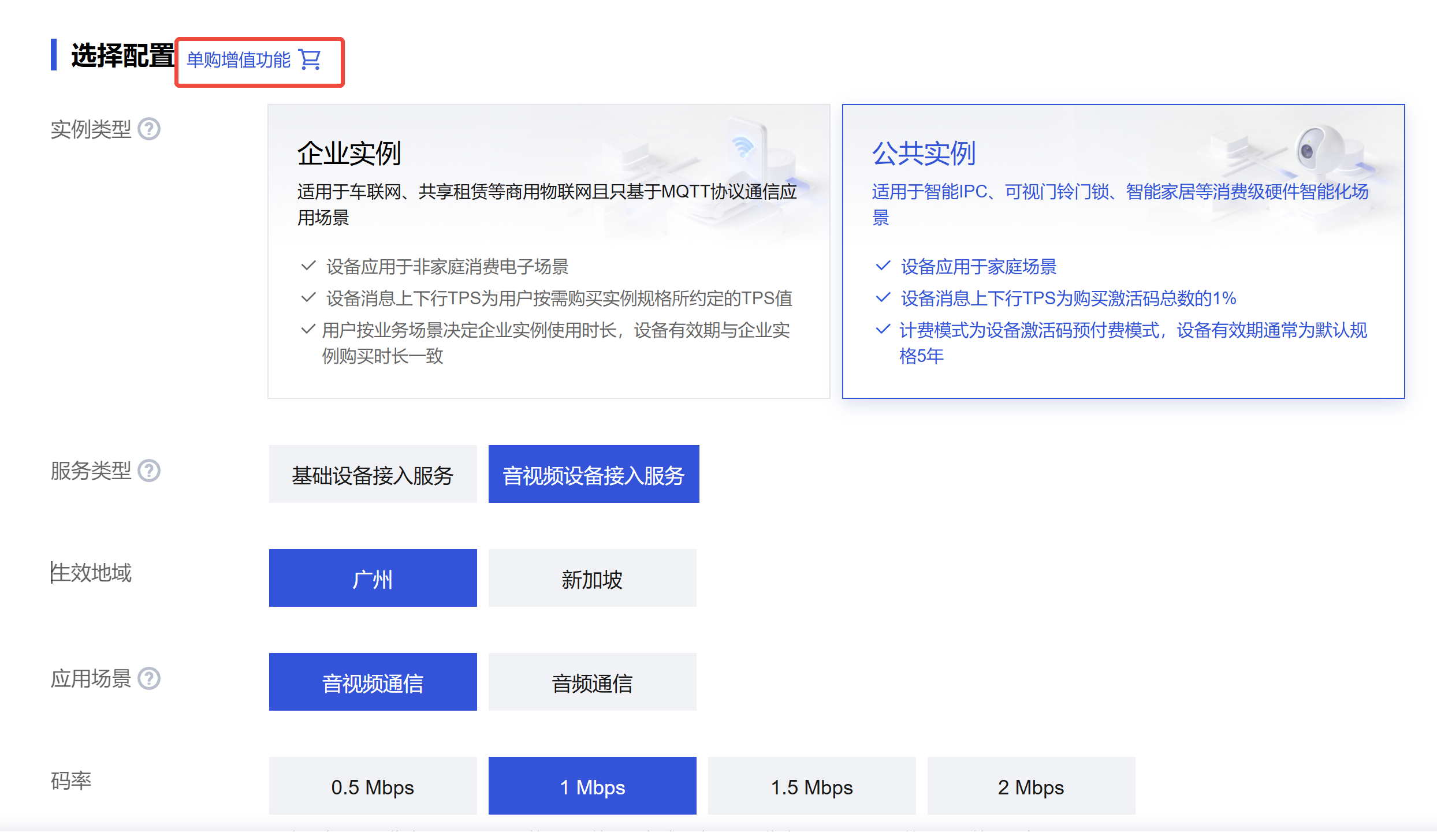 当您已购买音视频设备接入服务后,才会显示单购增值功能入口。