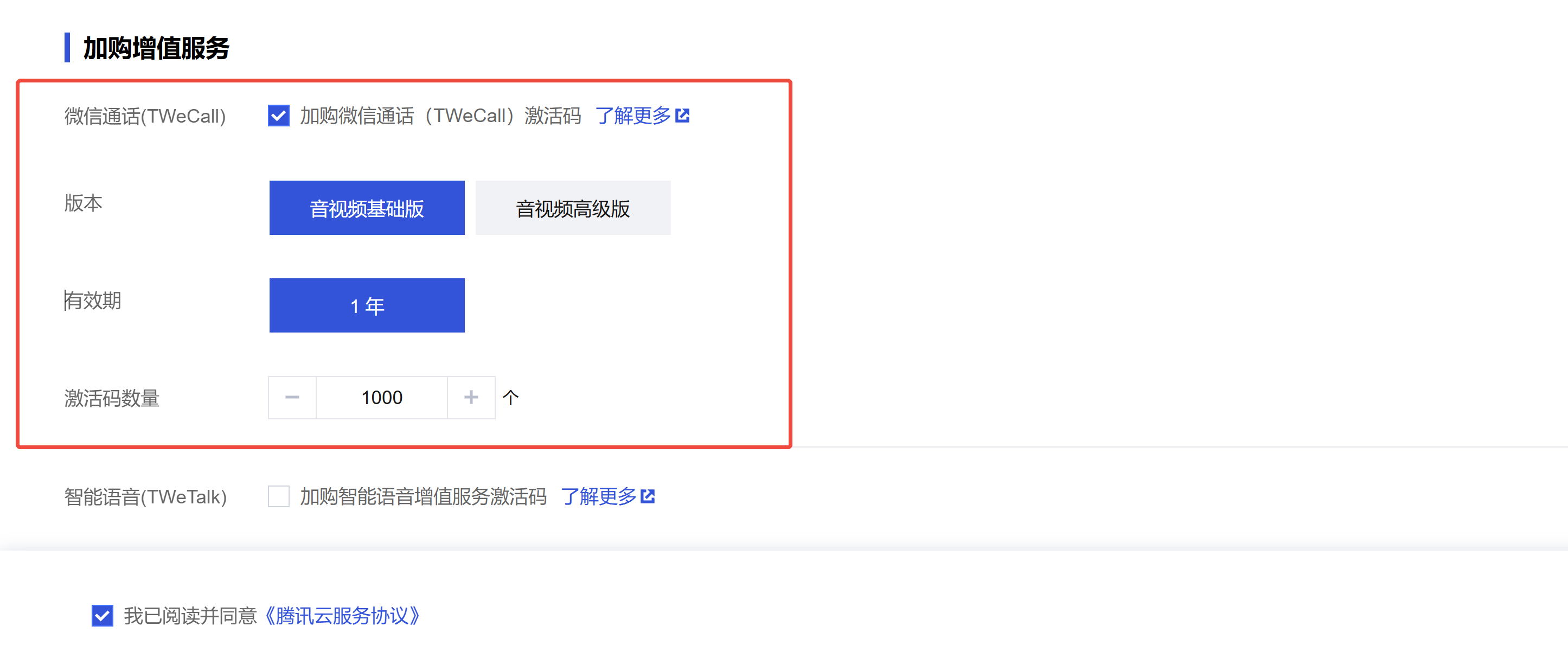 1. 单击购买页“选择配置”旁的单购增值功能,将切换为单独购买微信通话(TWeCall)激活码的购买页面。