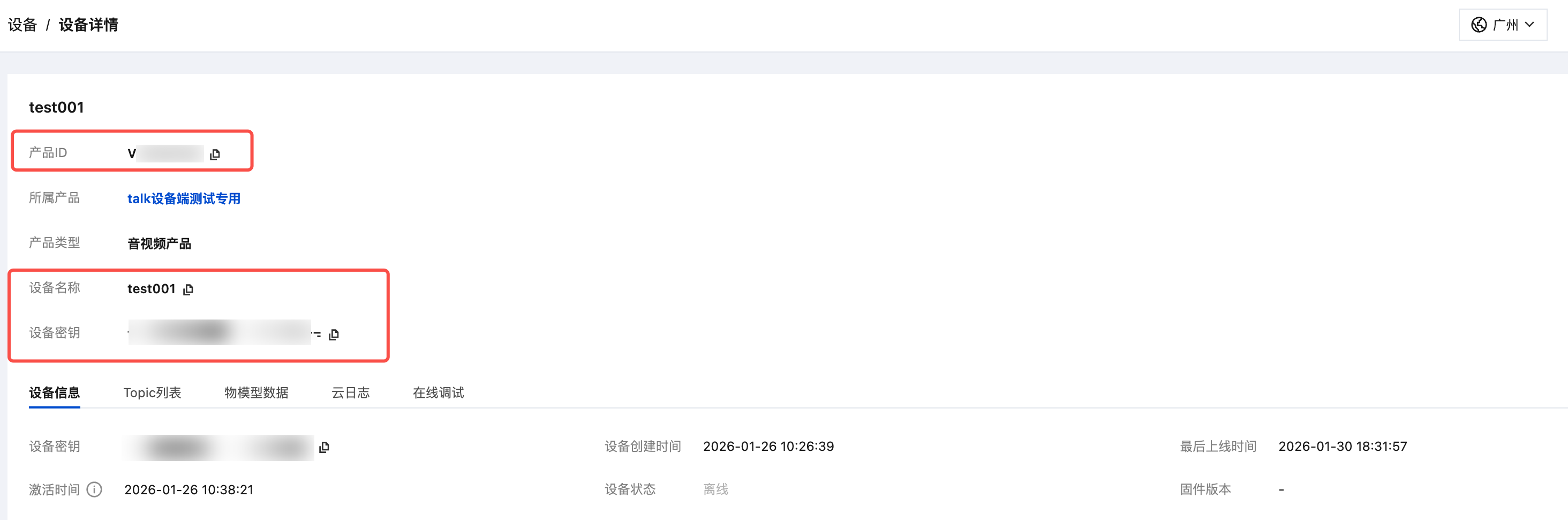 3. 进入设备页面,新建一个设备,并获取到设备的三元组:产品ID,设备名称,设备密钥。具体操作可参见 创建设备。