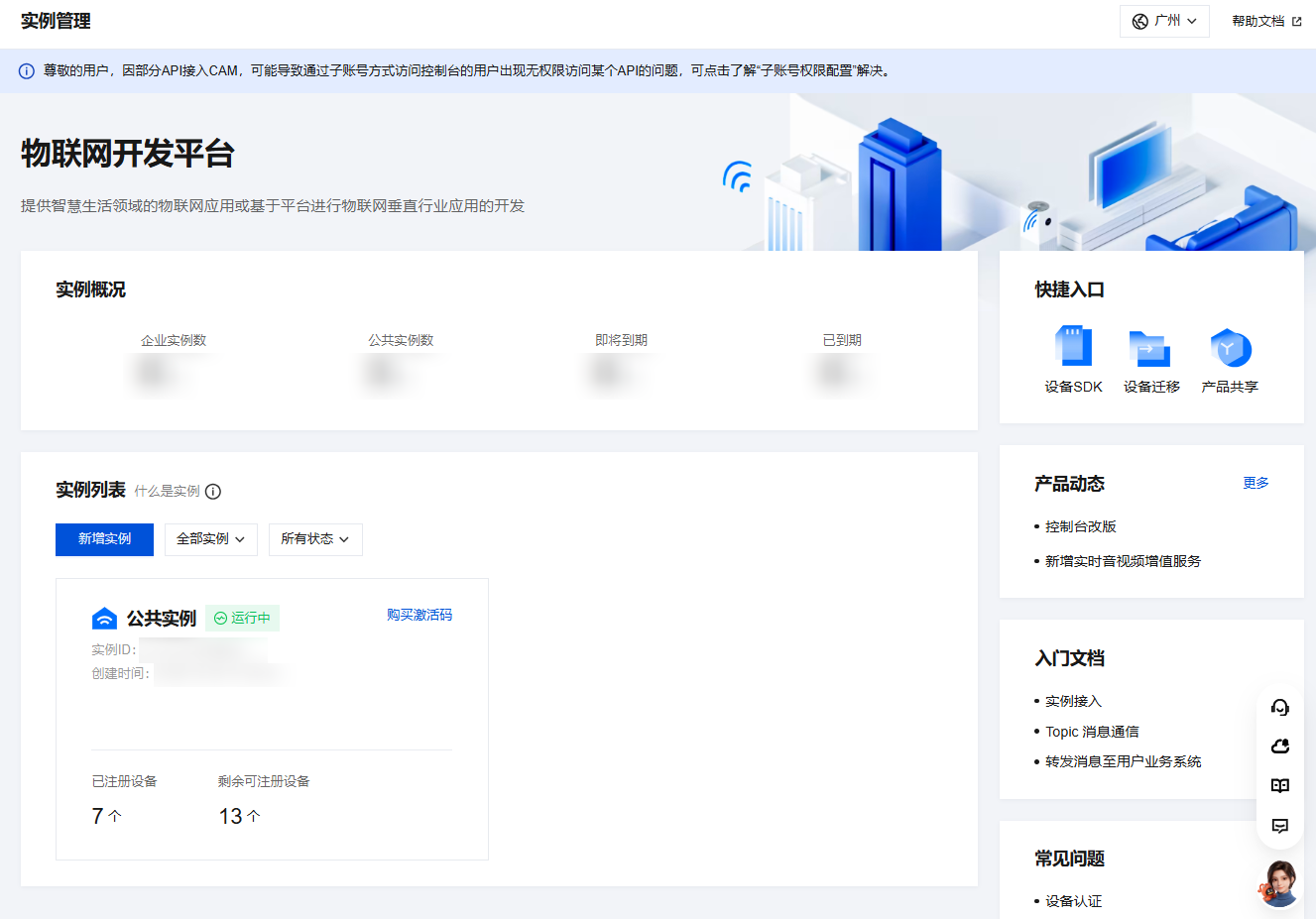 1. 注册腾讯云账号并登录腾讯云物联网开发平台 控制台。如果是第一次登录,会默认有一个公共实例。