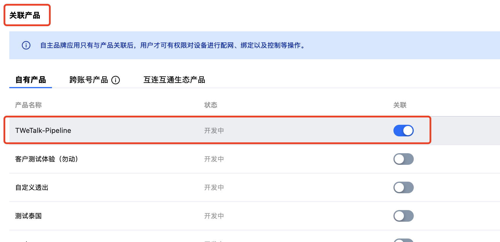 3. 在应用开发的关联产品模块下,选择 入门指引 中新创建的产品并关联在一起。